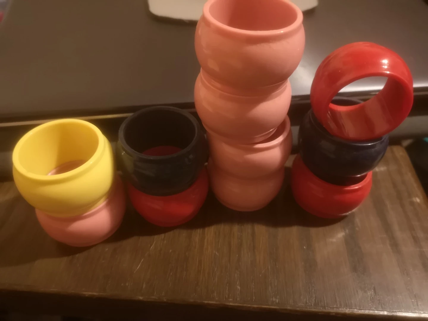 Selling a set of 8 napkin rings! They come in a variety of colours: pink, yellow, red and navy blue..... AI said that's black and now I'm not sure.