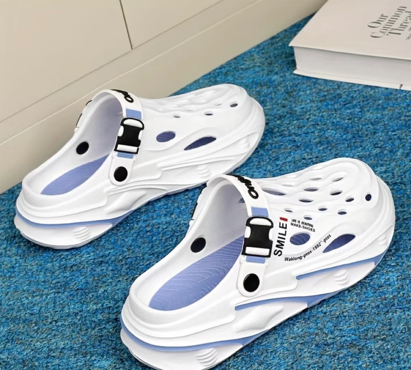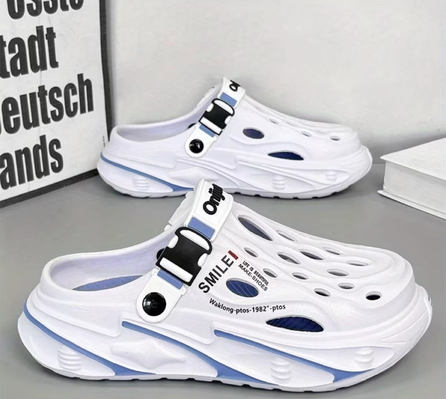 Check out these Onijum clogs! They're white with blue accents and have a fun 'Smile' design. Perfect for casual wear and super comfy
