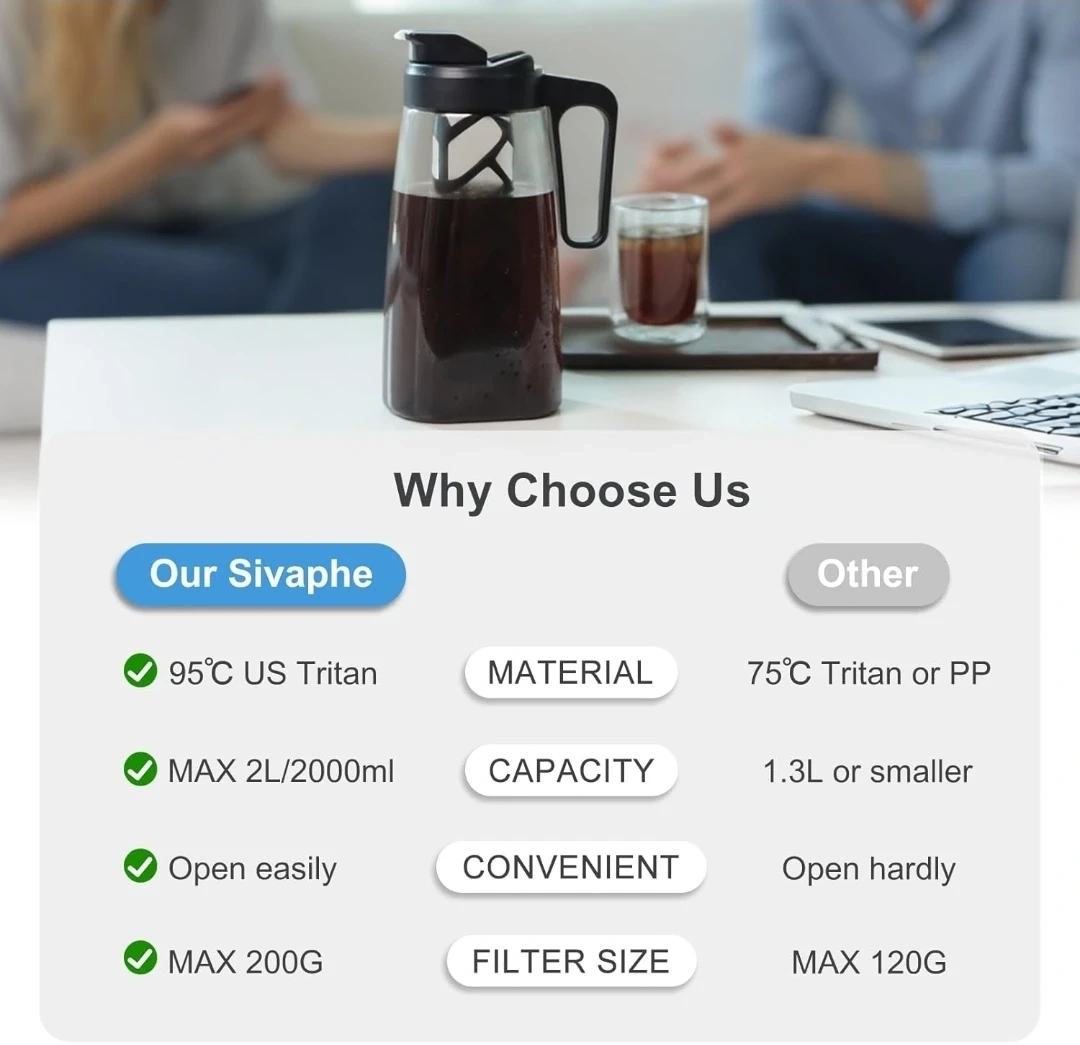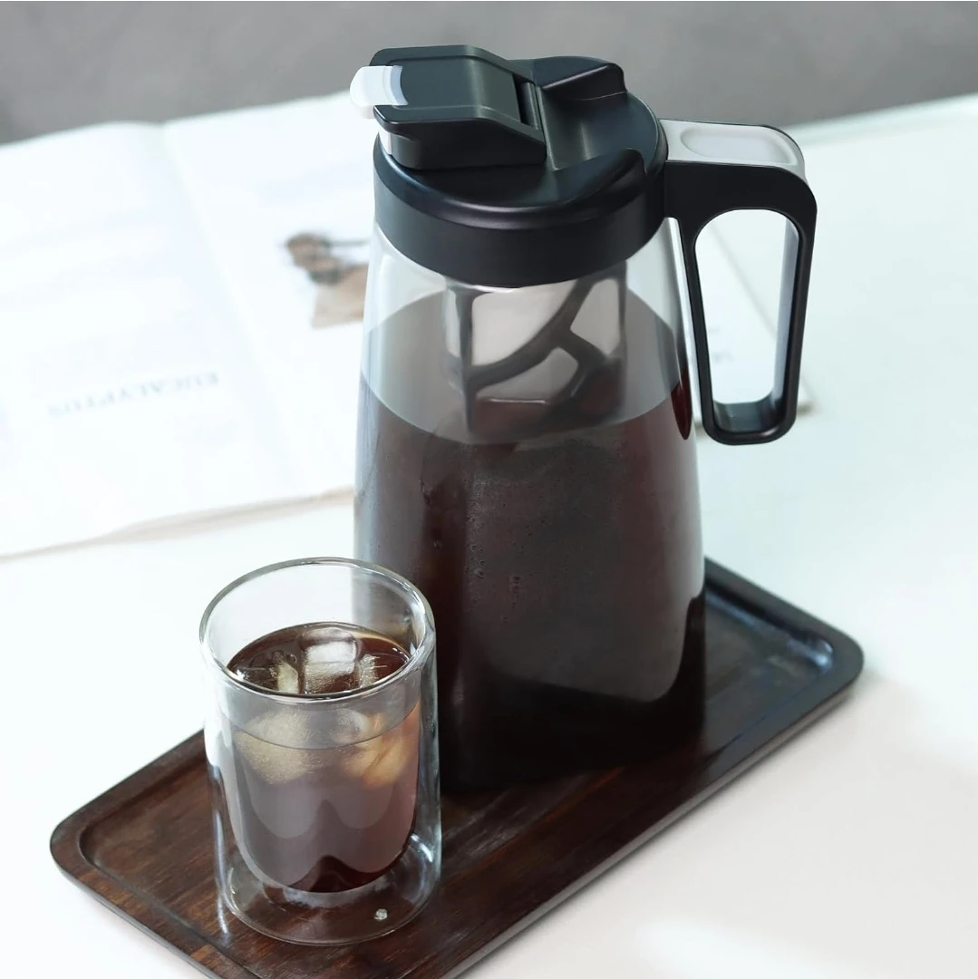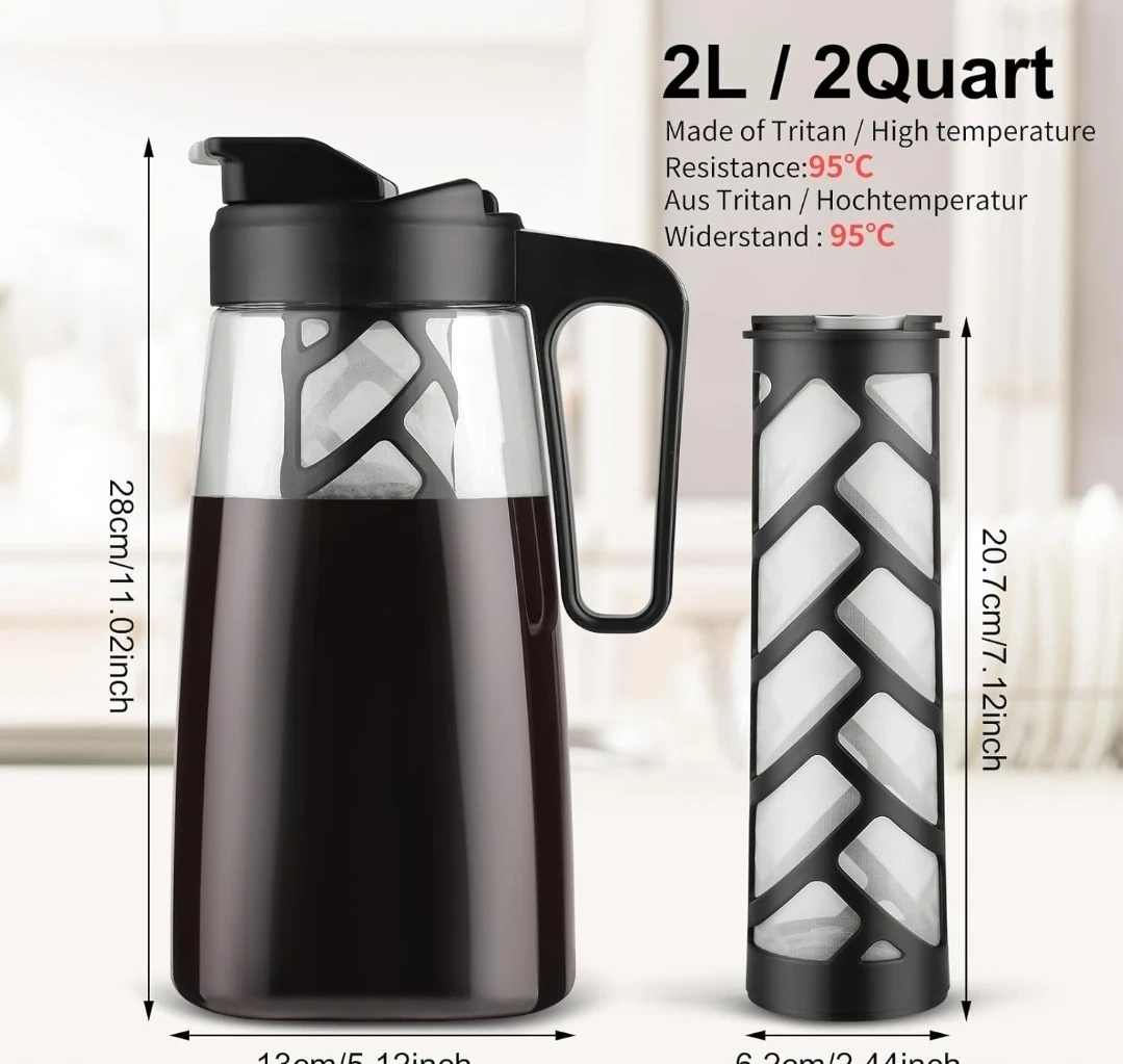 This Sivaphe large ice cold coffee maker is perfect for making cold brew, tea, or infused drinks. It's made of Tritan and is high temperature resistant. It's a 2L/2 quart pitcher with a reusable filter. It's dishwasher safe and leak proof.