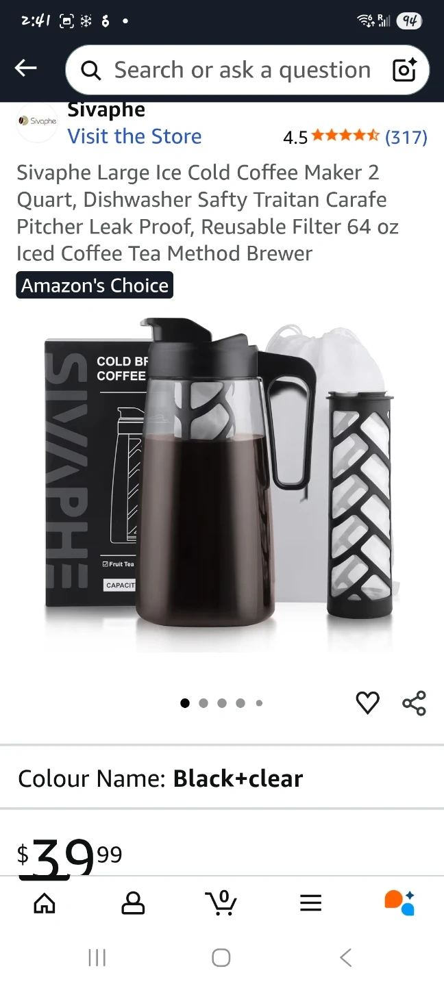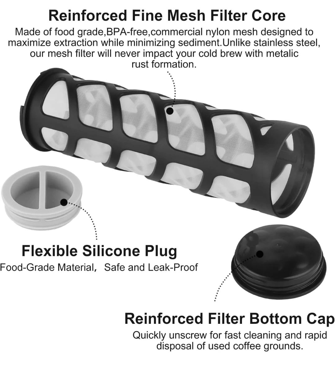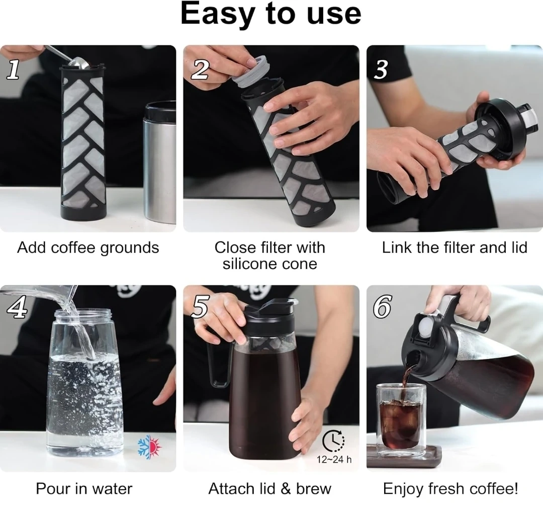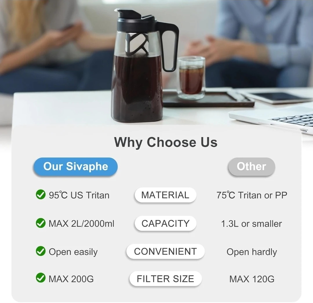 This Sivaphe large ice cold coffee maker is perfect for making cold brew, tea, or infused drinks. It's made of Tritan and is high temperature resistant. It's a 2L/2 quart pitcher with a reusable filter. It's dishwasher safe and leak proof.