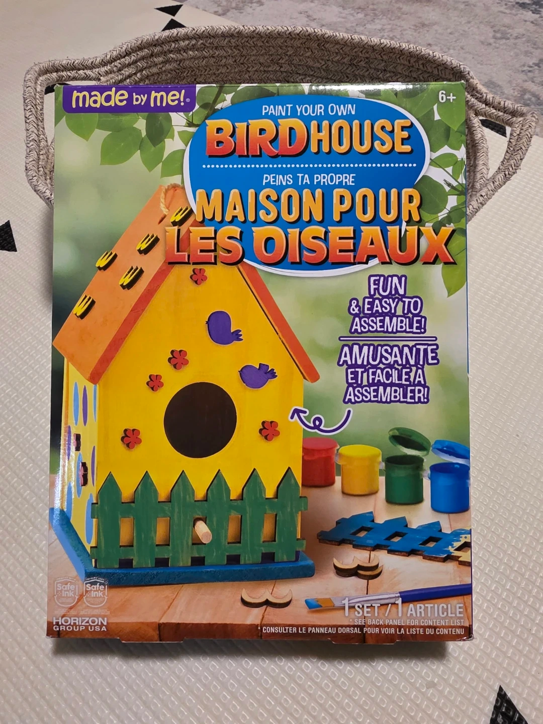 Get creative with this Made By Me! Paint Your Own Birdhouse kit! It includes everything you need to build and decorate your own birdhouse: a wooden birdhouse, strips of acrylic paint, a paint brush, a tube of glue, and easy-to-follow instructions! Fun and easy to assemble, making it a great activity for kids aged 6+