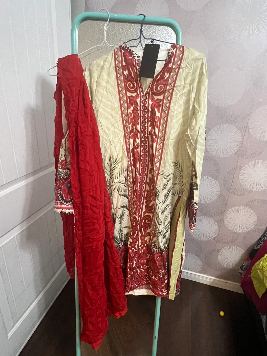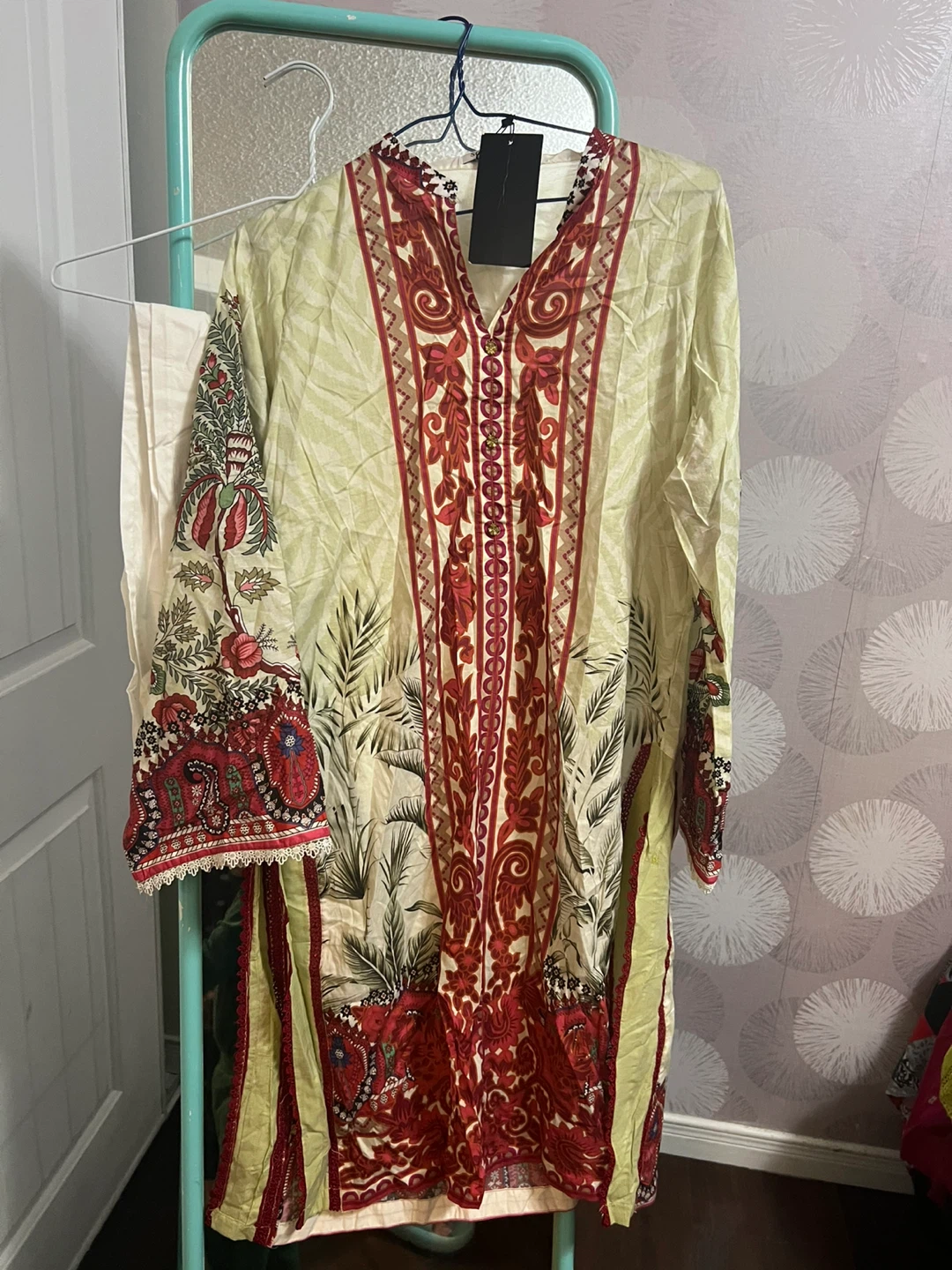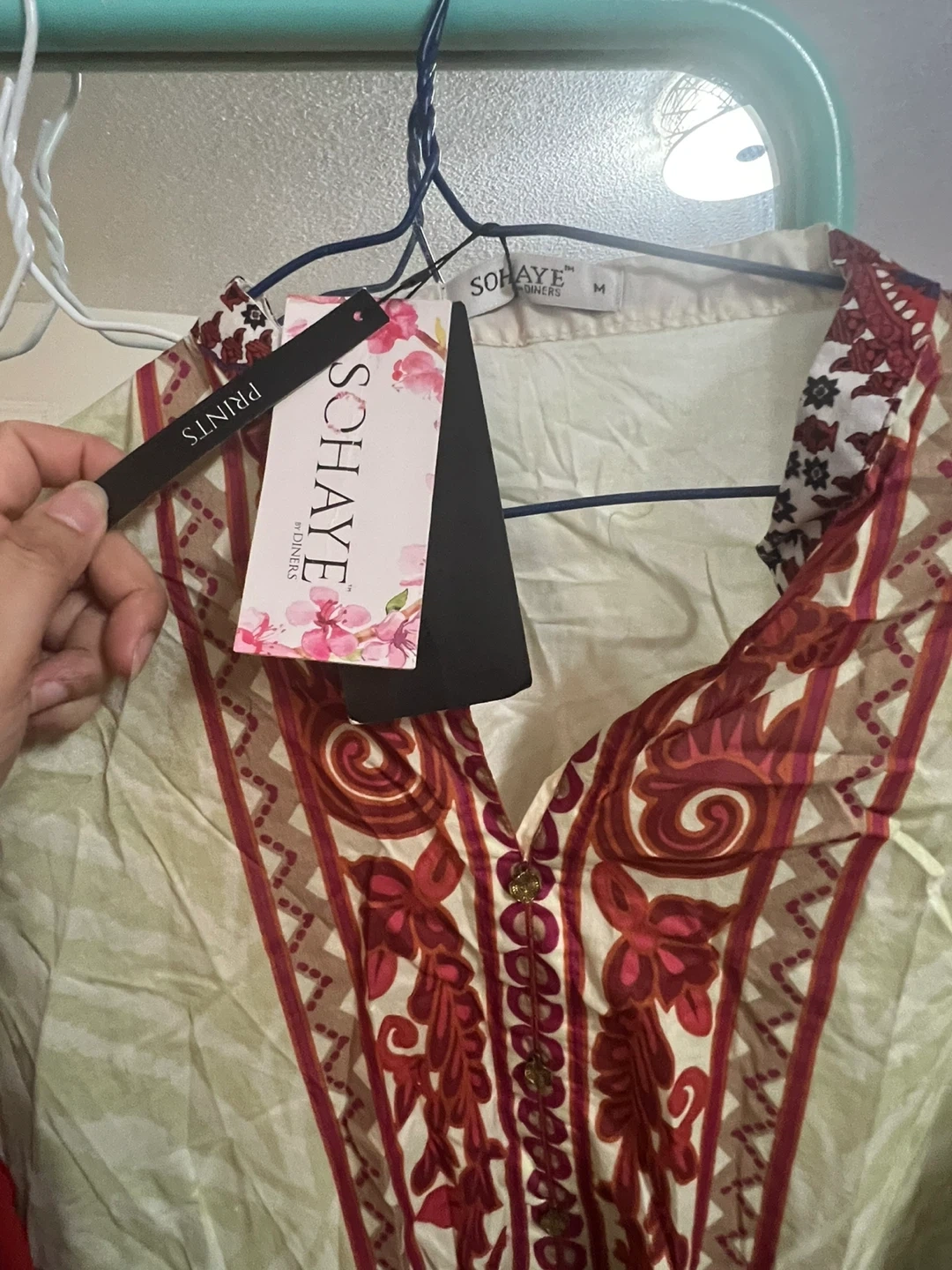 Selling a beautiful Sohaye Prints salwar kameez in size M. The set includes the kameez (top), salwar (pants), and dupatta (scarf). The material feels lovely and the design is quite unique!