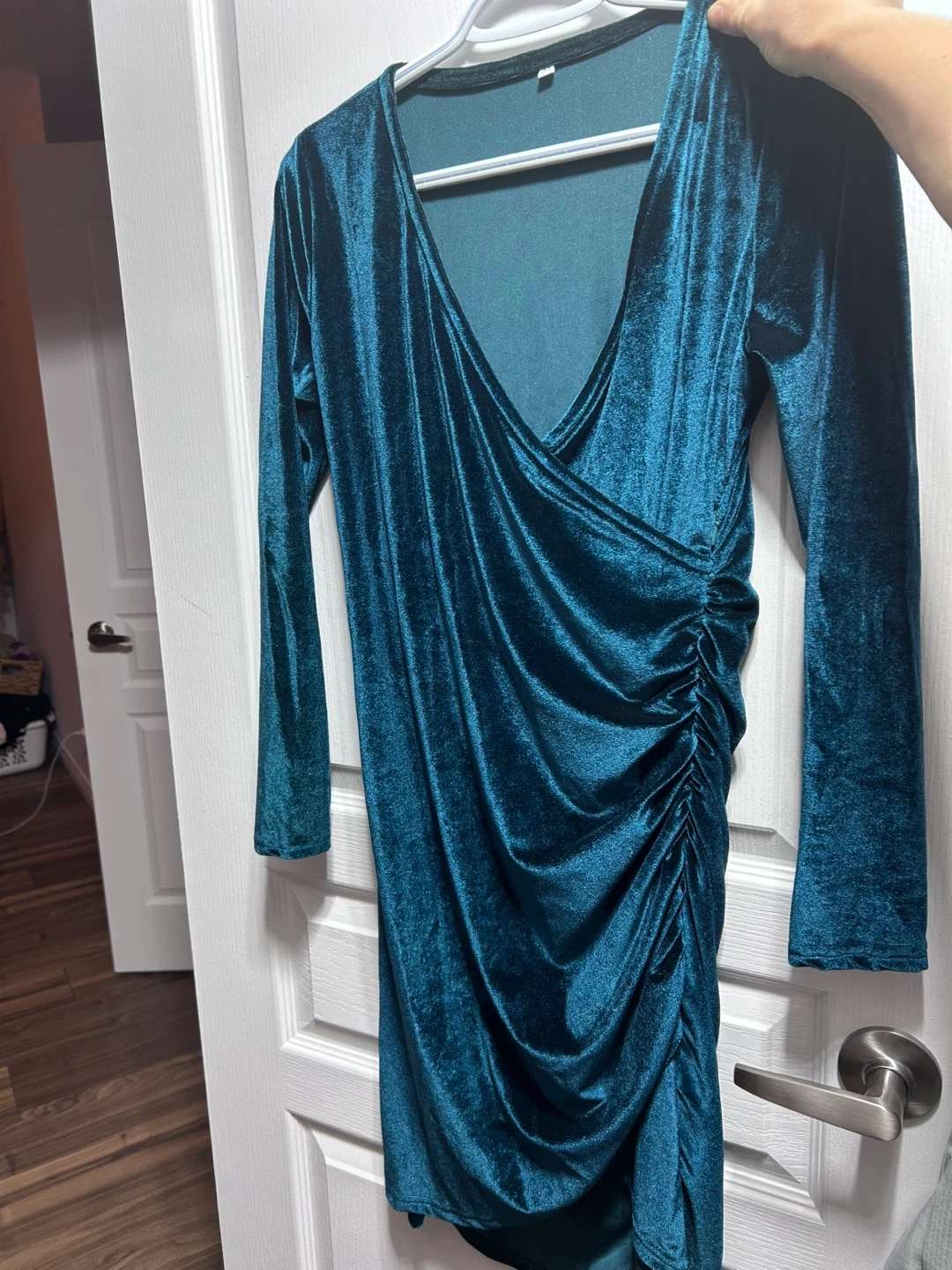 Selling a cute velvet wrap dress in a beautiful teal colour! The photo that I took looks more blue than it really is, the dress leans more towards dark teal/green. Bought the dress on Amazon a year ago. Did not fit right for me, but they would not take it back.