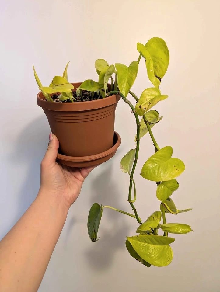 Healthy neon pothos plant in 6" pot with drainage and saucer. Has a small amount of browning but is healthy and growing leaves.