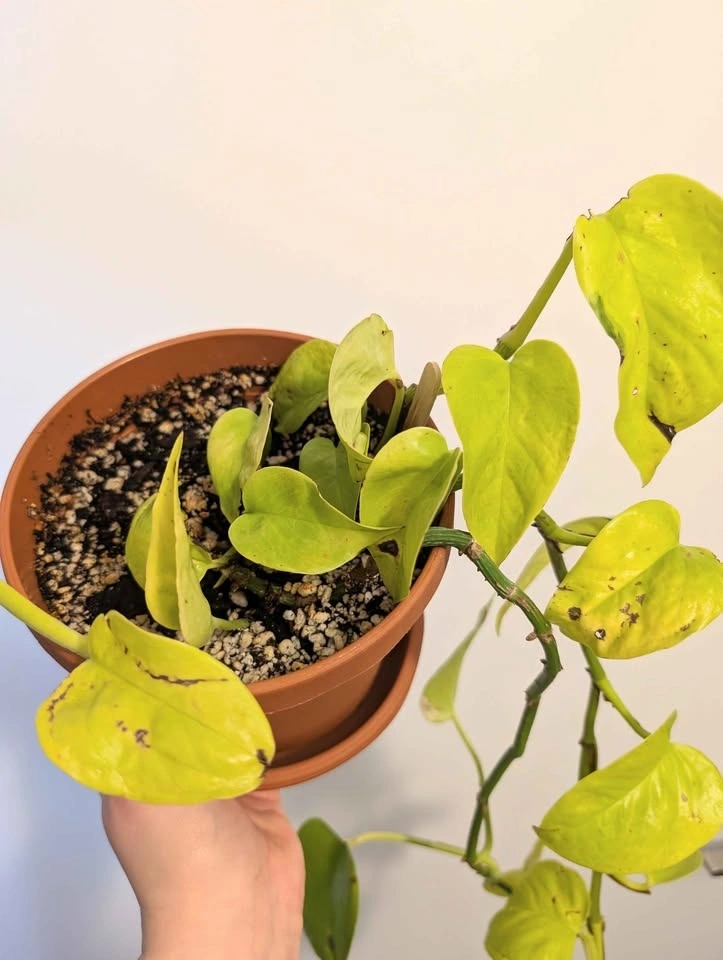 Healthy neon pothos plant in 6" pot with drainage and saucer. Has a small amount of browning but is healthy and growing leaves.