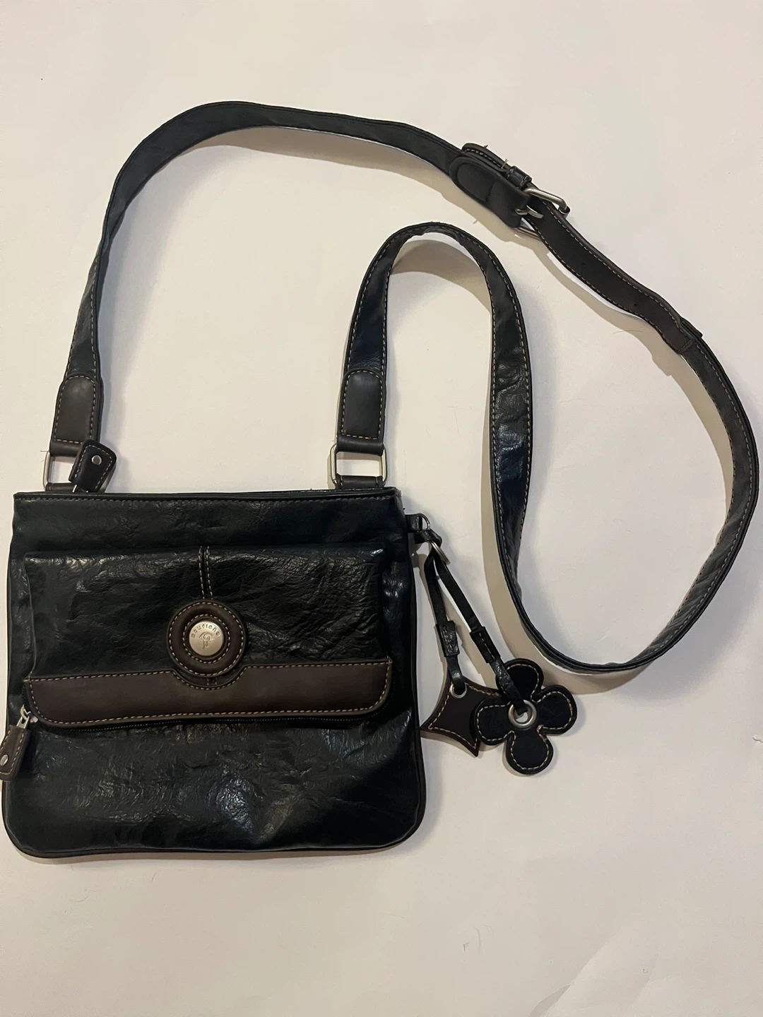 This mouflon crossbody bag is in great condition! It's black with dark brown accents and has a cute flower charm. Perfect for everyday use or travel