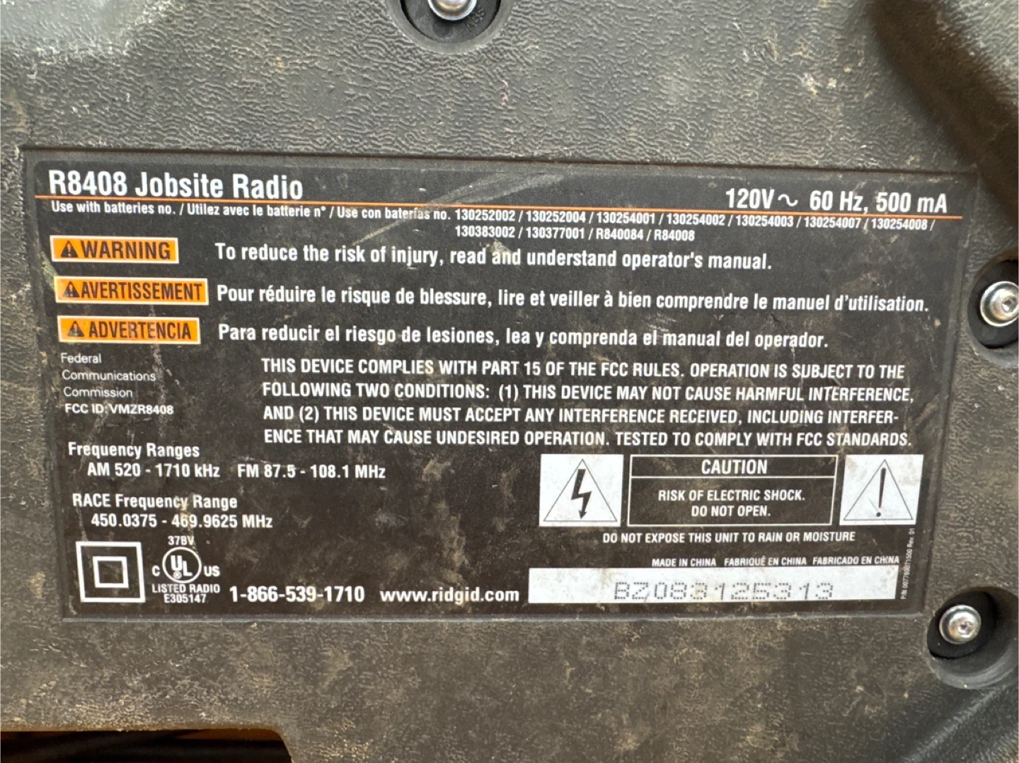Selling a Ridgid R8408 Jobsite Radio. It operates at 120V ~ 60 Hz, 500 mA and has frequency ranges of AM 520 - 1710 kHz and FM 87.5 - 108.1 MHz. It also has an AUX input.