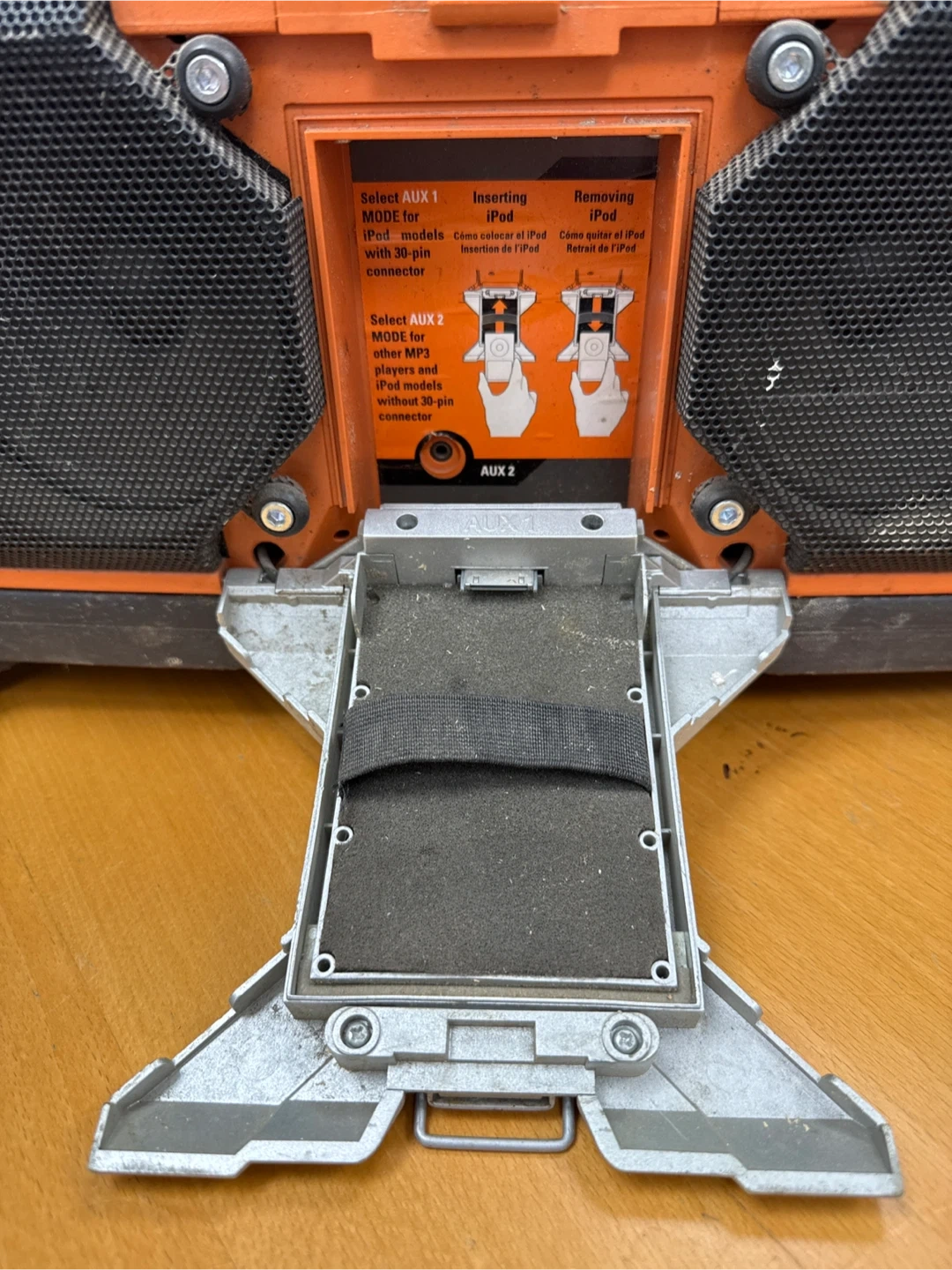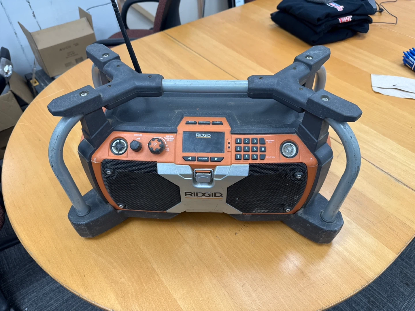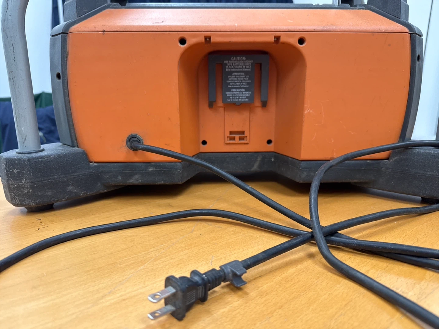 Selling a Ridgid R8408 Jobsite Radio. It operates at 120V ~ 60 Hz, 500 mA and has frequency ranges of AM 520 - 1710 kHz and FM 87.5 - 108.1 MHz. It also has an AUX input.