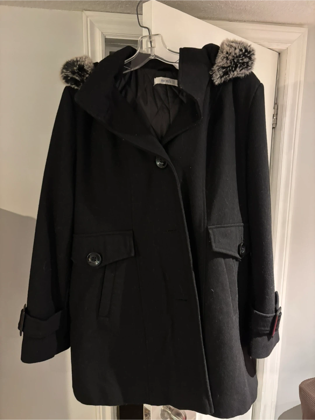 A stylish black winter coat from Rickis. It features a faux fur hood to keep you warm and cozy during the colder months. Perfect for adding a touch of elegance to your winter wardrobe!