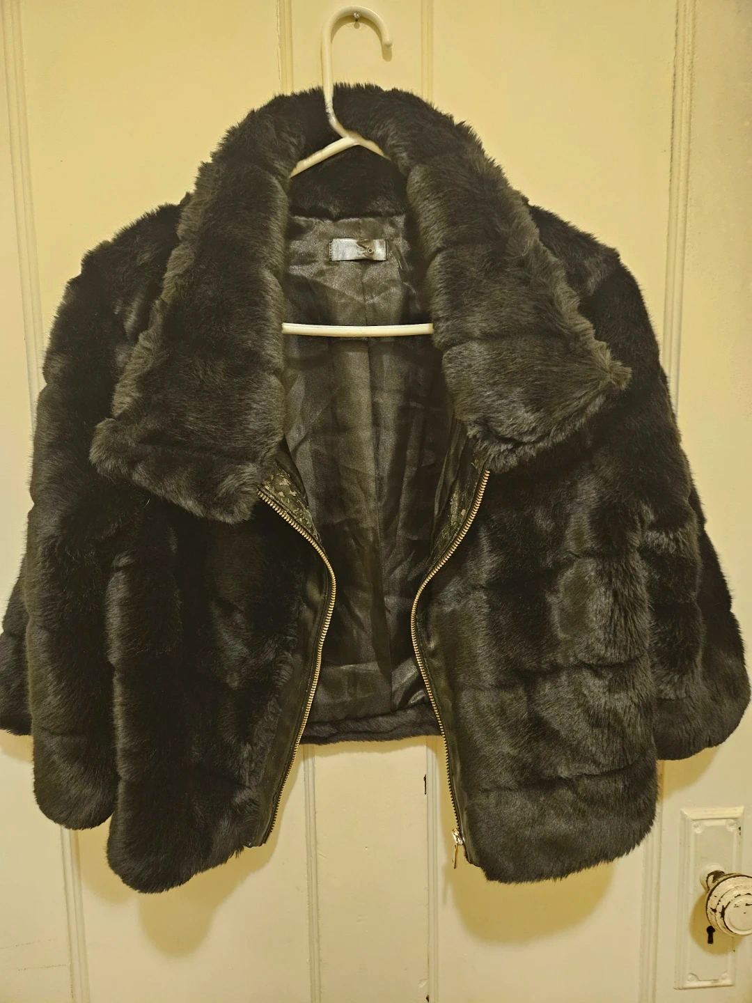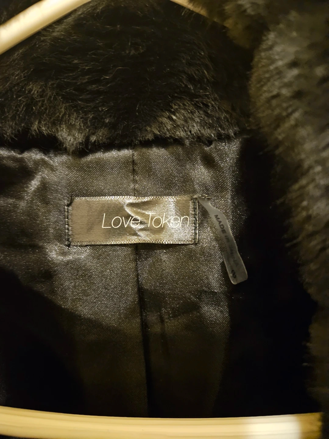 Selling a Love Token faux fur jacket in black! It's super soft and stylish, perfect for adding a touch of glam to any outfit. Please note there is some wear on the inside lining near the zipper.