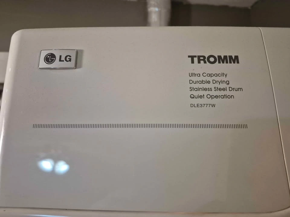 The LG DLE3777W Tromm is a 27-inch wide, 7.3 cu. ft. electric dryer featuring a NeveRust stainless steel drum, sensor dry technology, 7 cycles, 5 temperature settings, and quiet operation with its LoDecibel system. Key specs include its stackable design, digital controls, customizable options like Wrinkle Care. Requires 240V, 30 Amps electrical hookup.