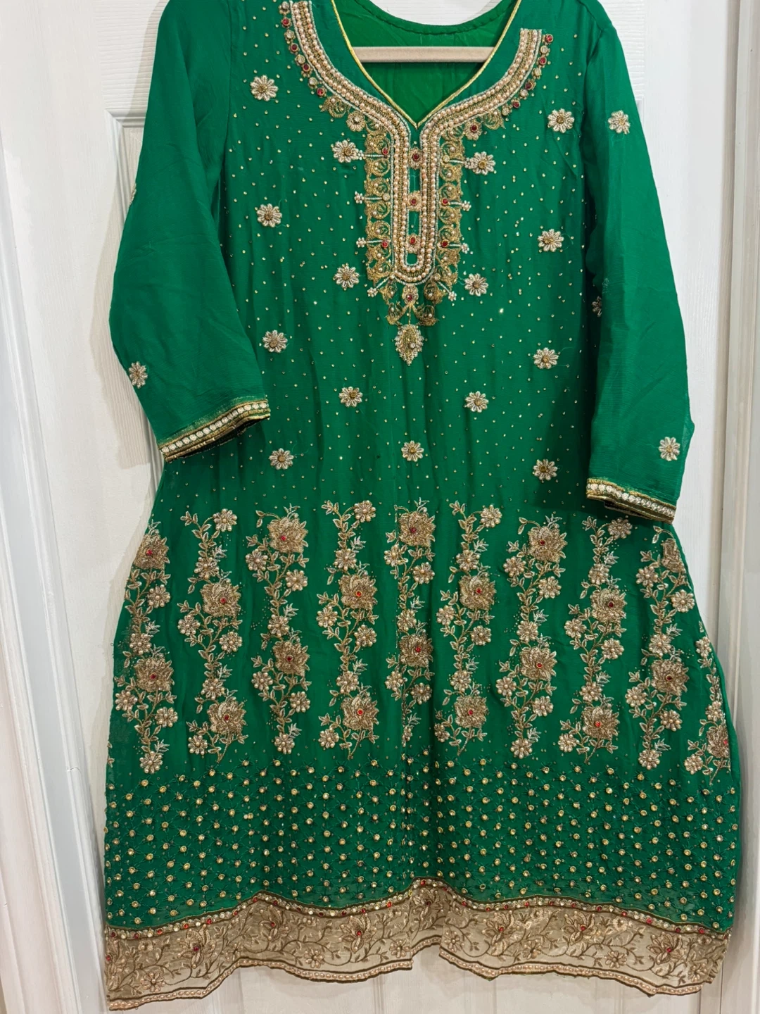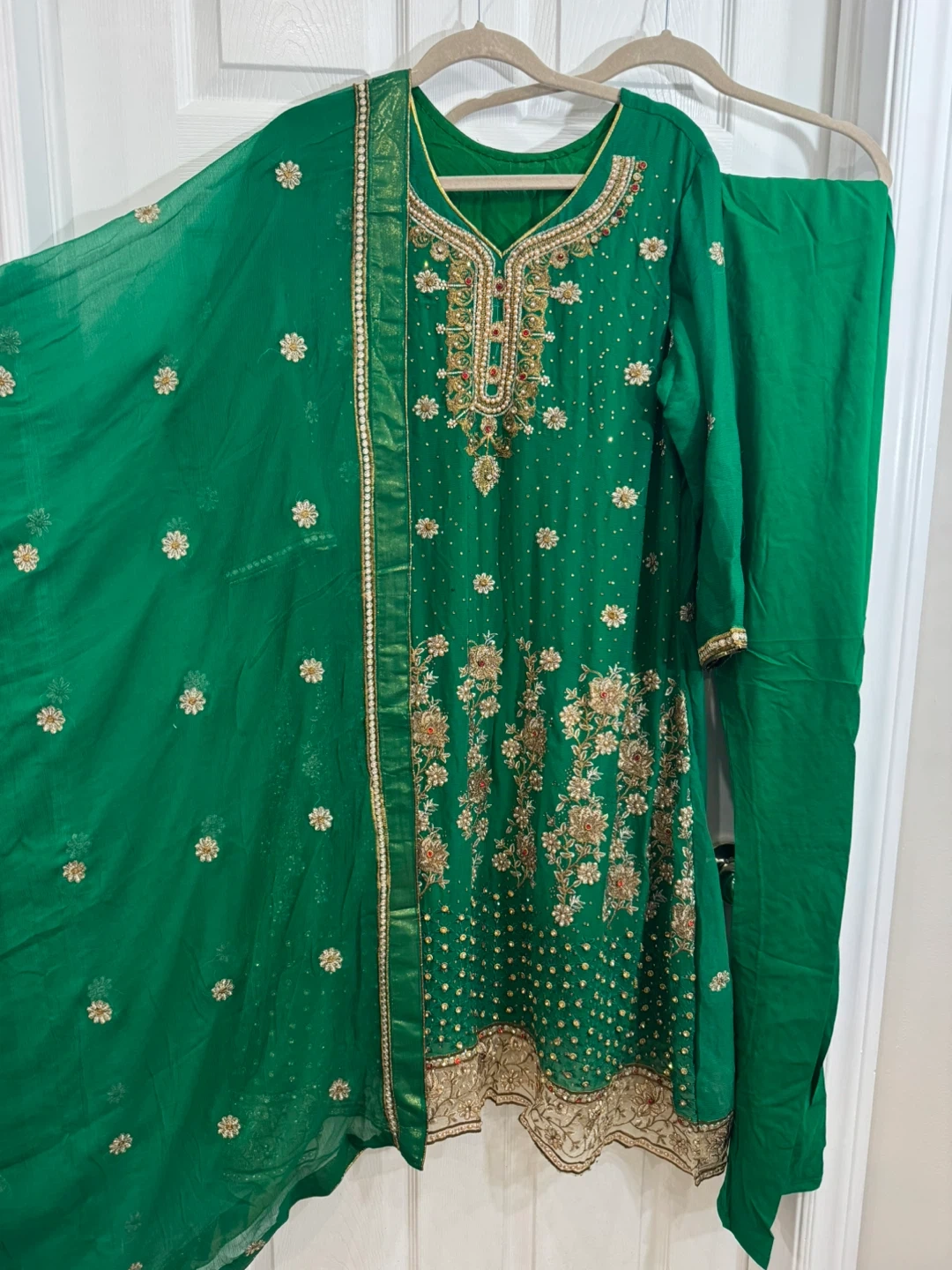 Beautiful green salwar kameez suit with intricate embroidery! Perfect for a special occasion or festive event. The set includes the kameez (tunic), churidaar (pants), and dupatta (scarf). The fabric is lightweight and comfortable, making it easy to wear. The embroidery features floral and traditional motifs in gold and red tones.