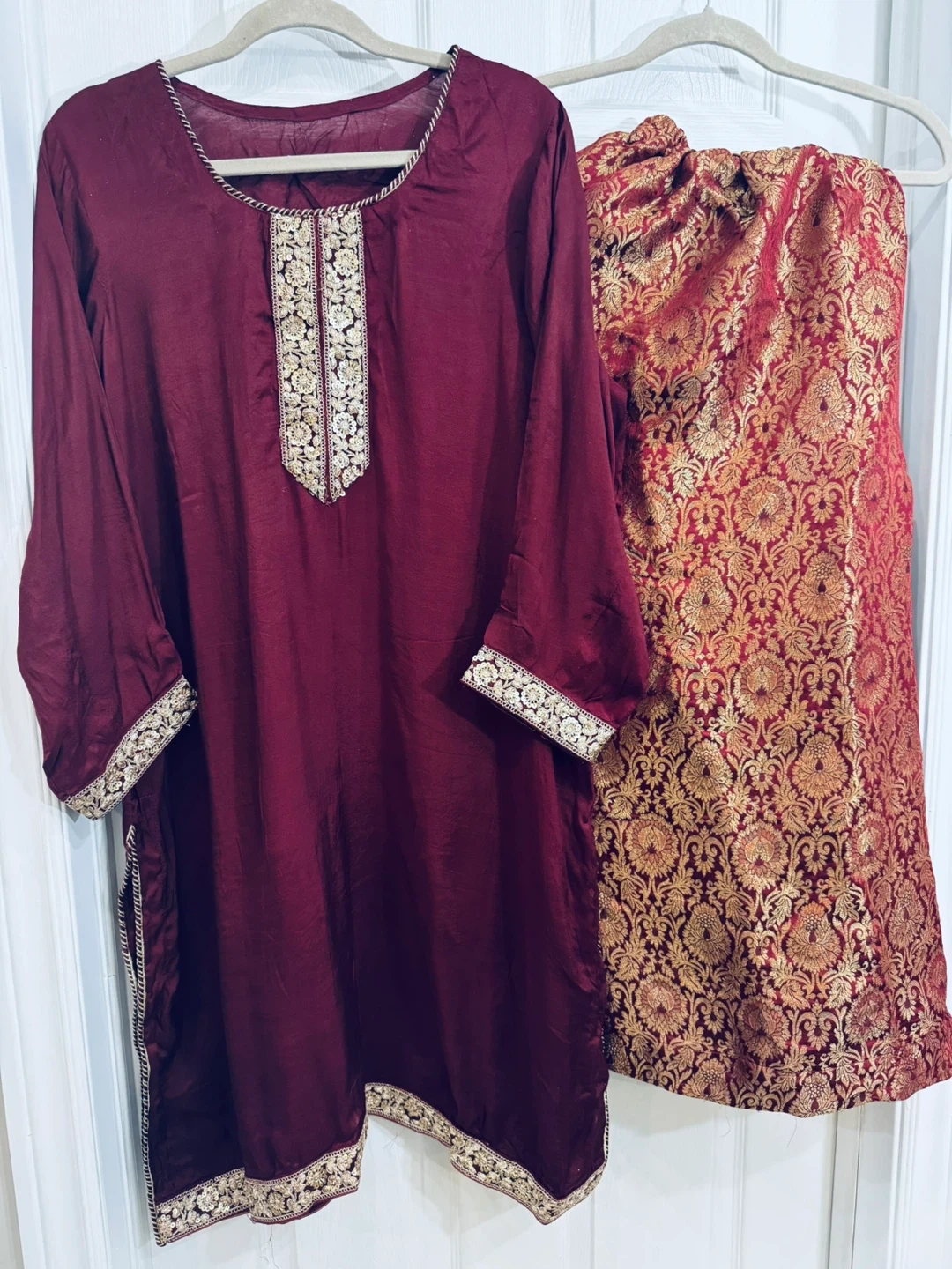 Beautiful Salwar Kameez suit in a rich burgundy colour with gold detailing. The fabric has a lovely sheen and the pants are Jamawar fabric. Perfect for a special occasion! 2pc