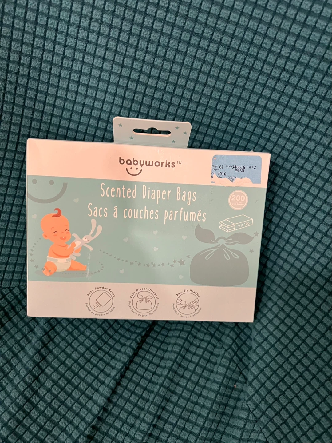 Selling a box of Babyworks scented diaper bags. These bags are designed for easy diaper disposal and have easy-tie handles. The box contains 200 bags (2 x 100).