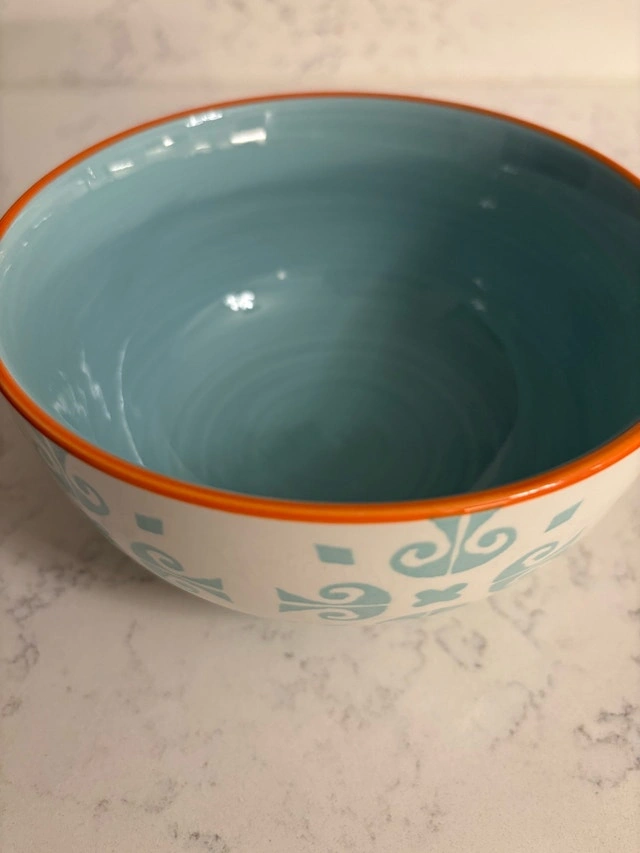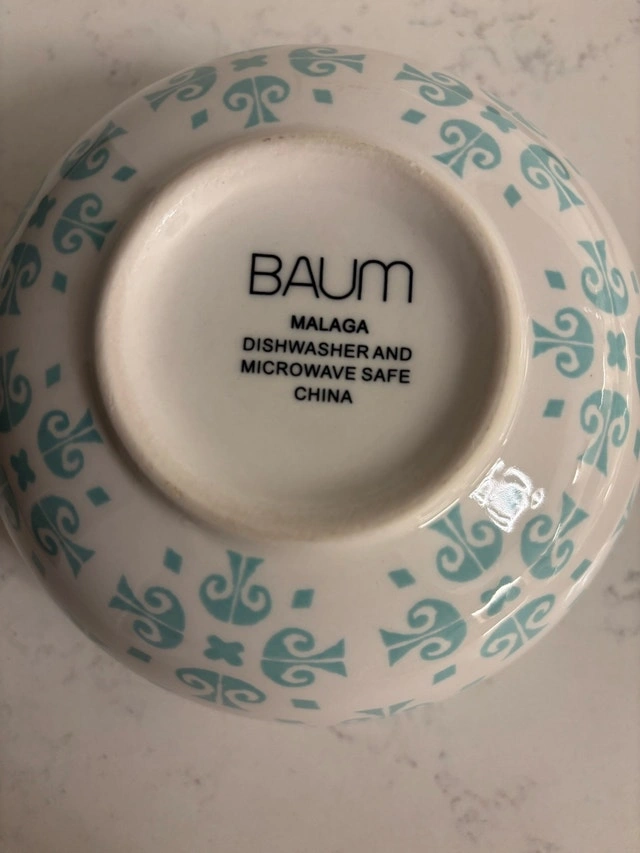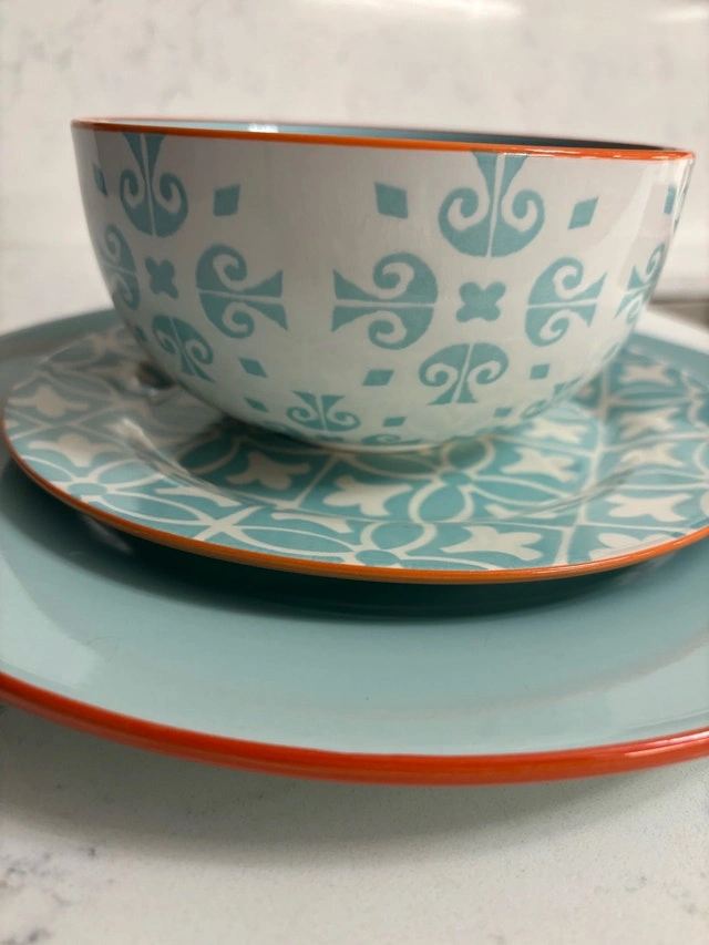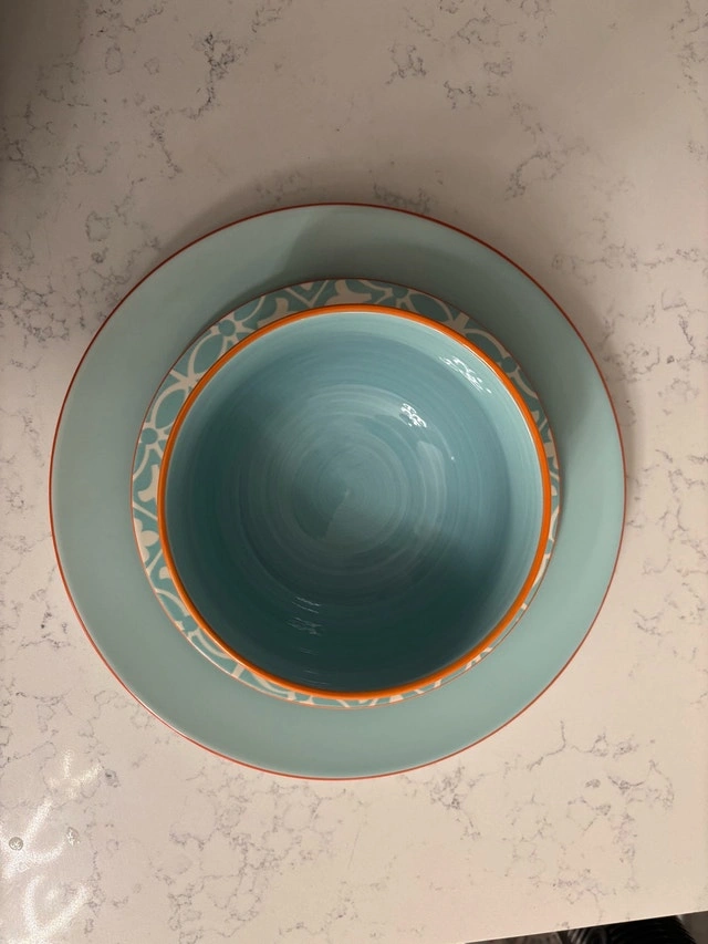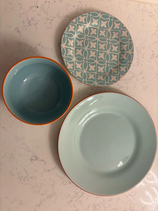 Beautiful turquoise and white Baum Malaga dish set with orange accents—perfect for adding some colour to your table. Set serves 8 and has lots of life left.