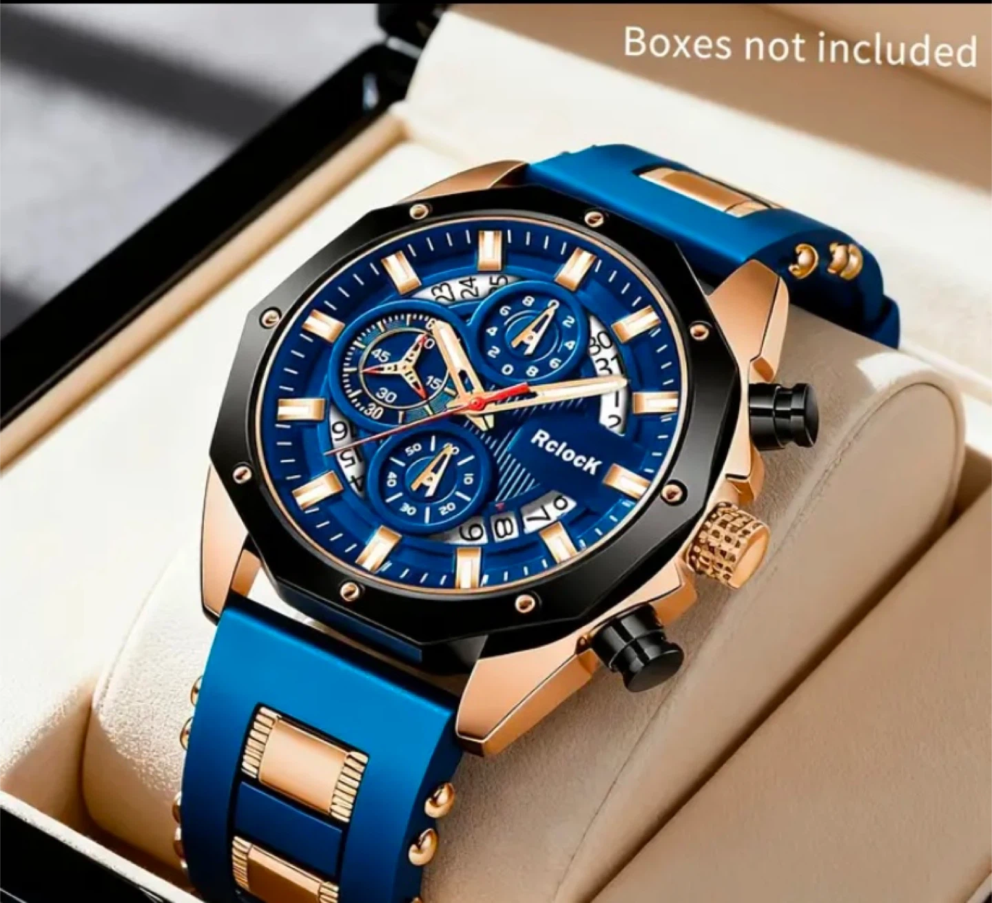 Selling a stylish Rclock men's watch! Features a striking blue and gold color scheme. This watch is sure to make a statement!