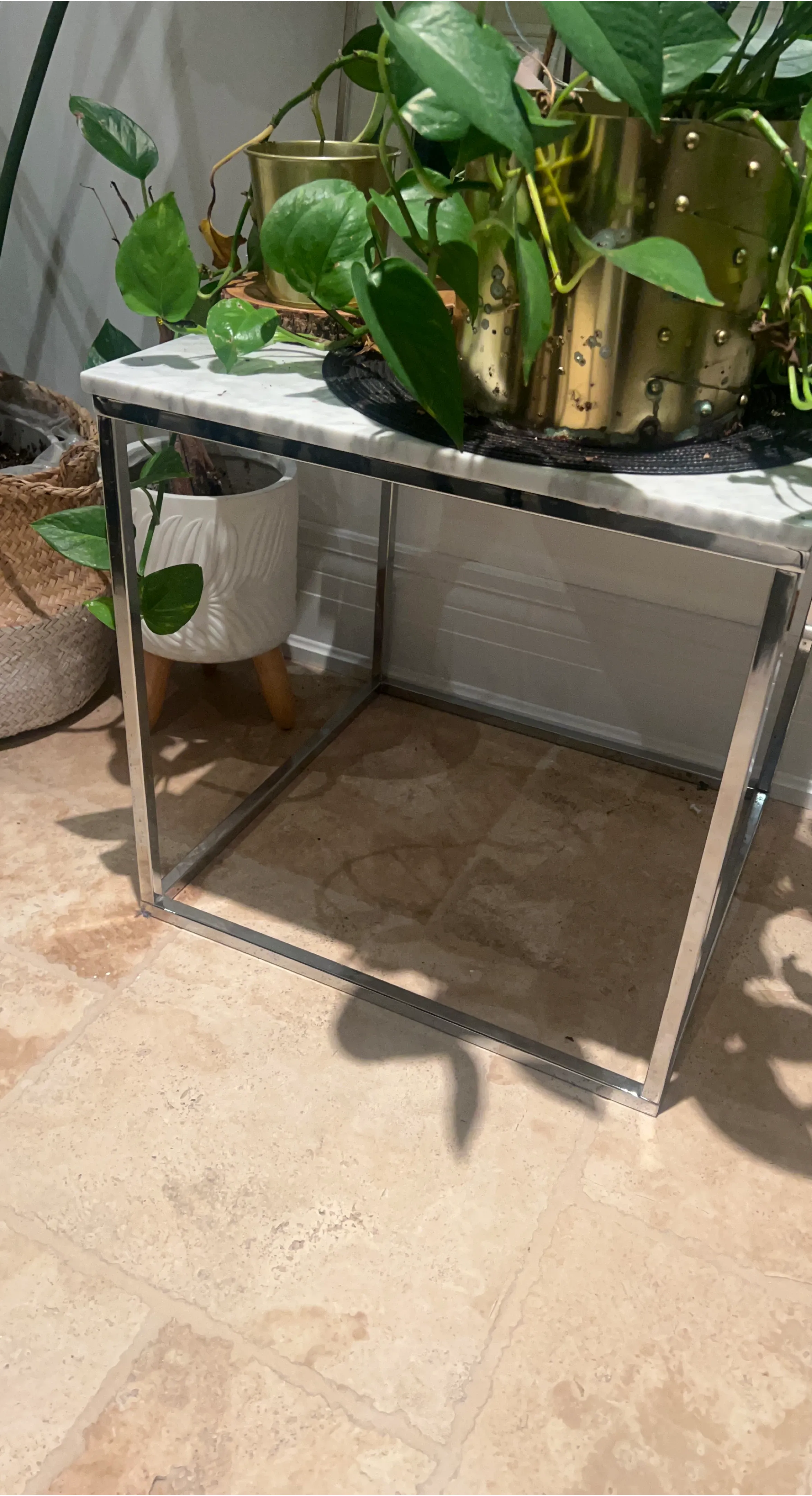 Selling a side table with a marble top and chrome frame. It's in good condition and would be a stylish addition to any room