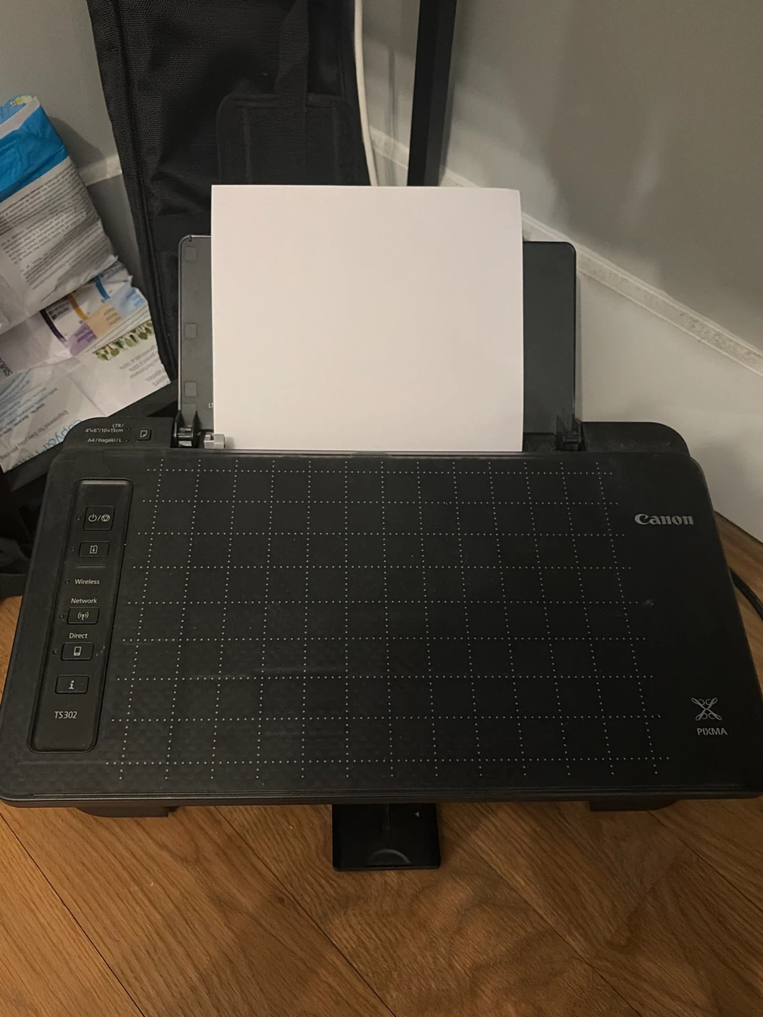 Selling a Canon PIXMA TS302 printer. It supports wireless network and direct printing. It prints 4"x6"/10x15cm and A4/Hagaki/L size papers.