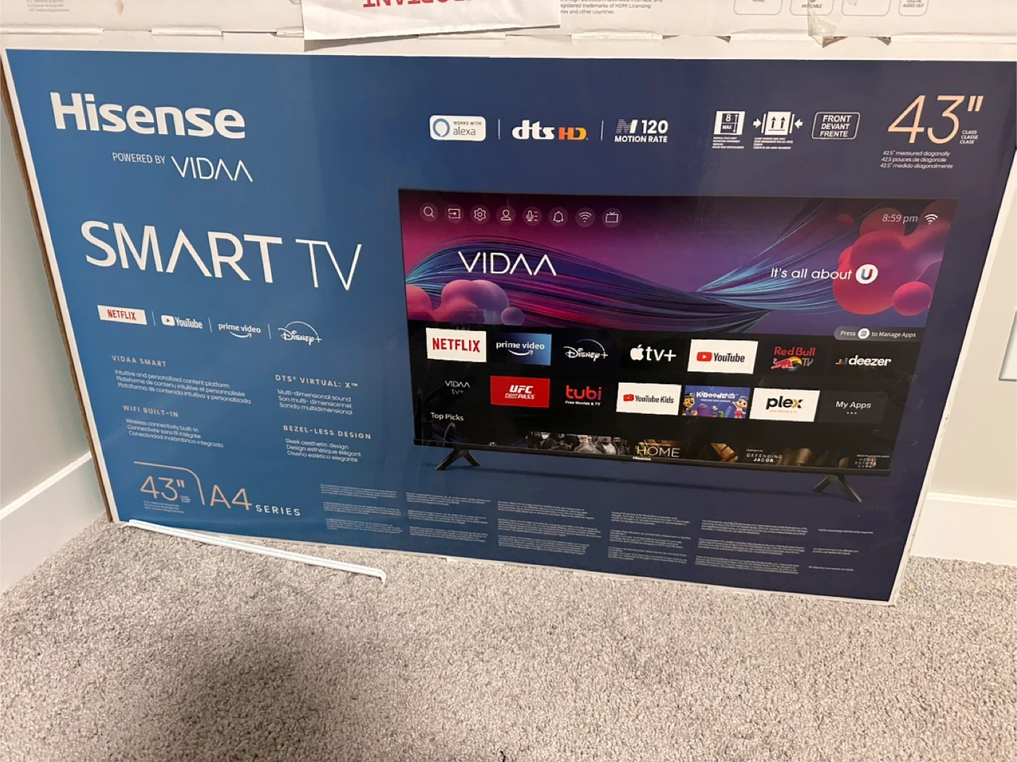 Selling a new, in-box Hisense 43" A4 Series Smart TV! For parts screen is broken It's powered by VIDAA and has a 120 motion rate. Enjoy easy access to Netflix, YouTube, Prime Video, and Disney+. It also features DTS Virtual: X and a bezel-less design. Perfect for streaming all your favourite shows and movies!