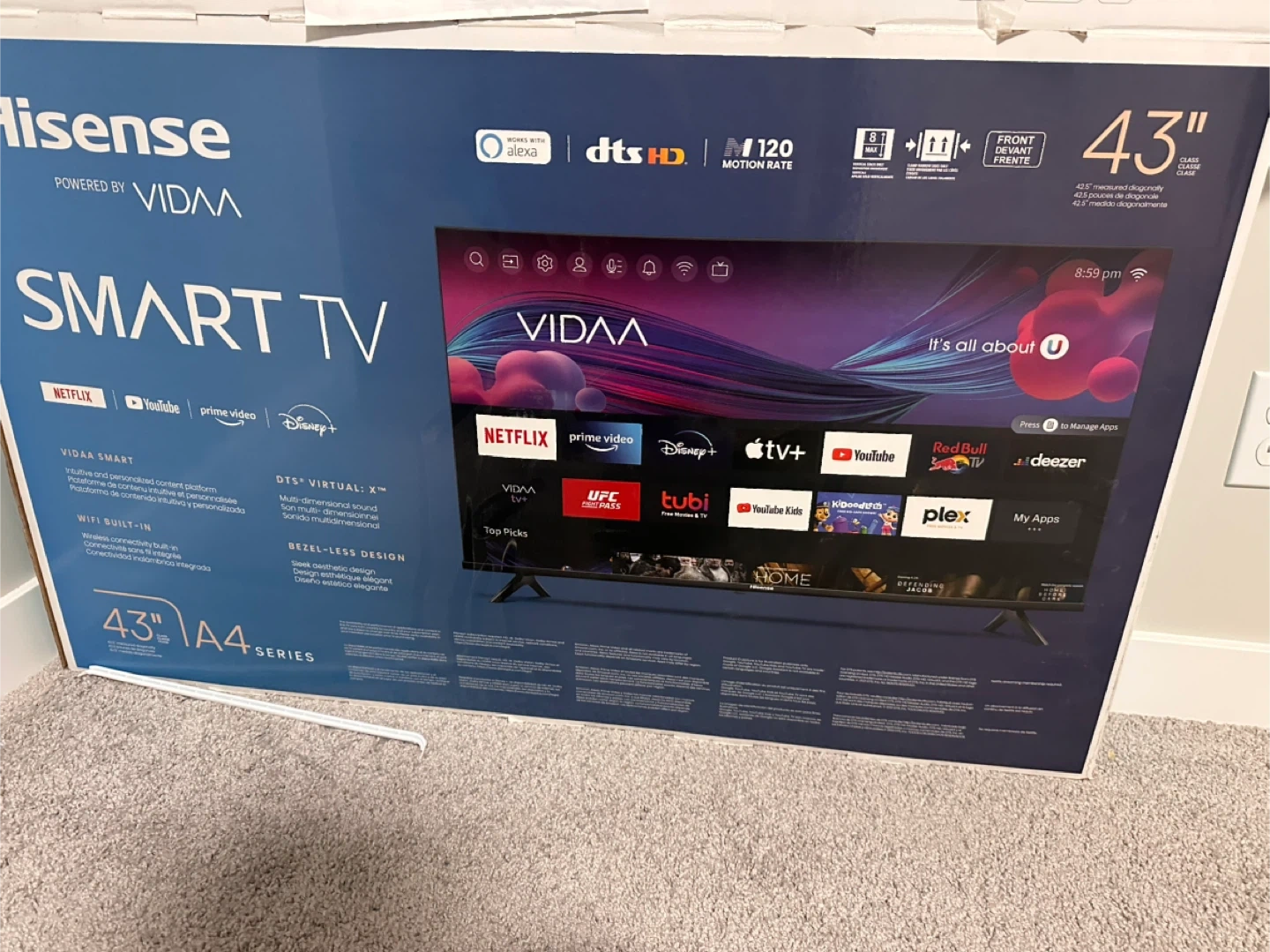 Selling a new, in-box Hisense 43" A4 Series Smart TV! For parts screen is broken It's powered by VIDAA and has a 120 motion rate. Enjoy easy access to Netflix, YouTube, Prime Video, and Disney+. It also features DTS Virtual: X and a bezel-less design. Perfect for streaming all your favourite shows and movies!