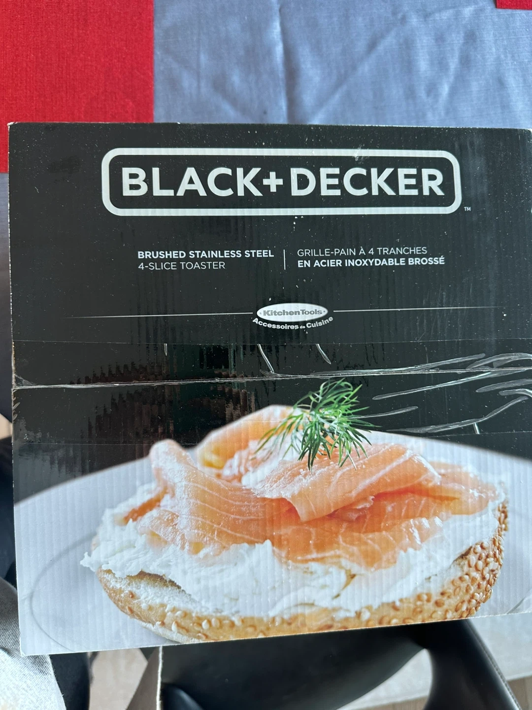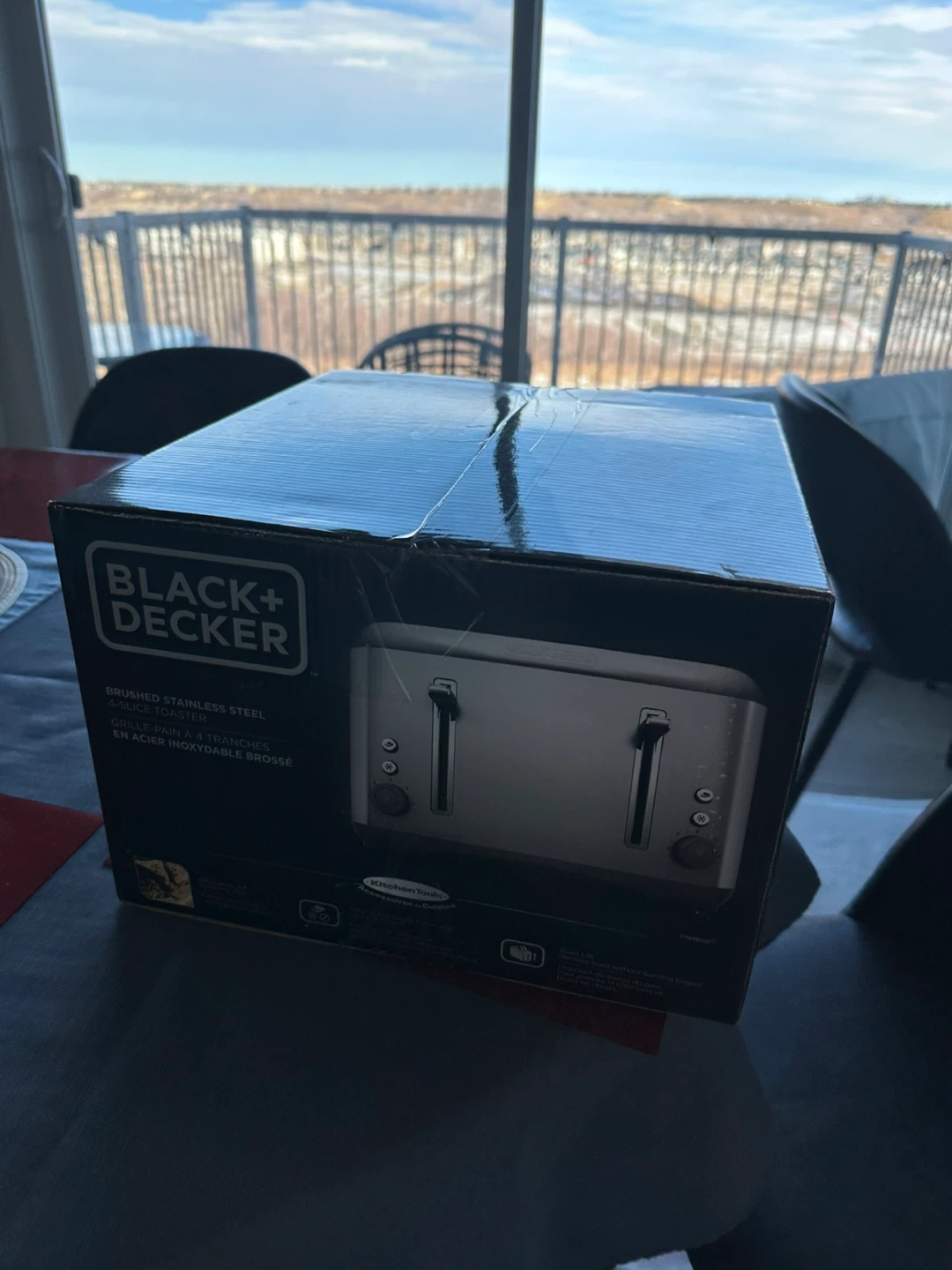 Selling a Black+Decker 4-slice toaster in brushed stainless steel! It comes with a drop-down crumb tray for quick and easy cleanup. The toaster also features extra-wide self-centering slots and a brushed stainless steel exterior. It's practical and versatile for toasting. Unopened. Pick up Walden