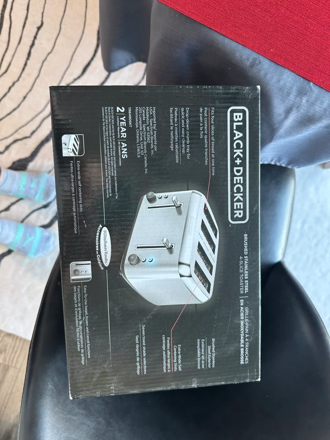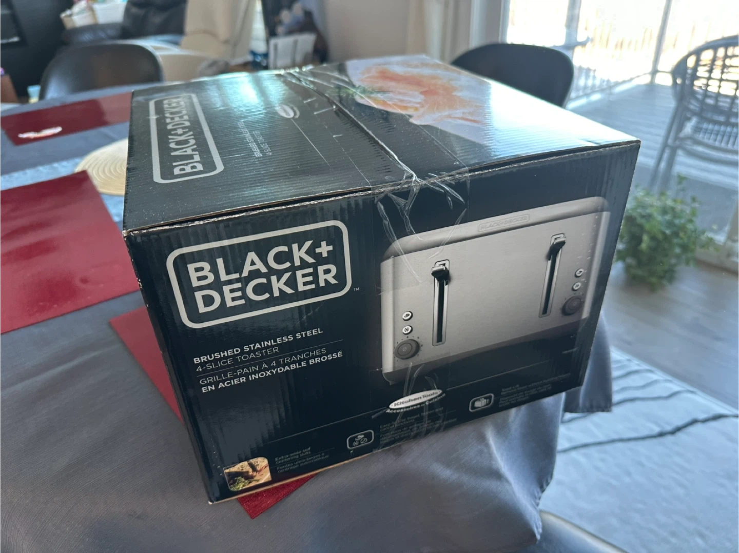 Selling a Black+Decker 4-slice toaster in brushed stainless steel! It comes with a drop-down crumb tray for quick and easy cleanup. The toaster also features extra-wide self-centering slots and a brushed stainless steel exterior. It's practical and versatile for toasting. Unopened. Pick up Walden