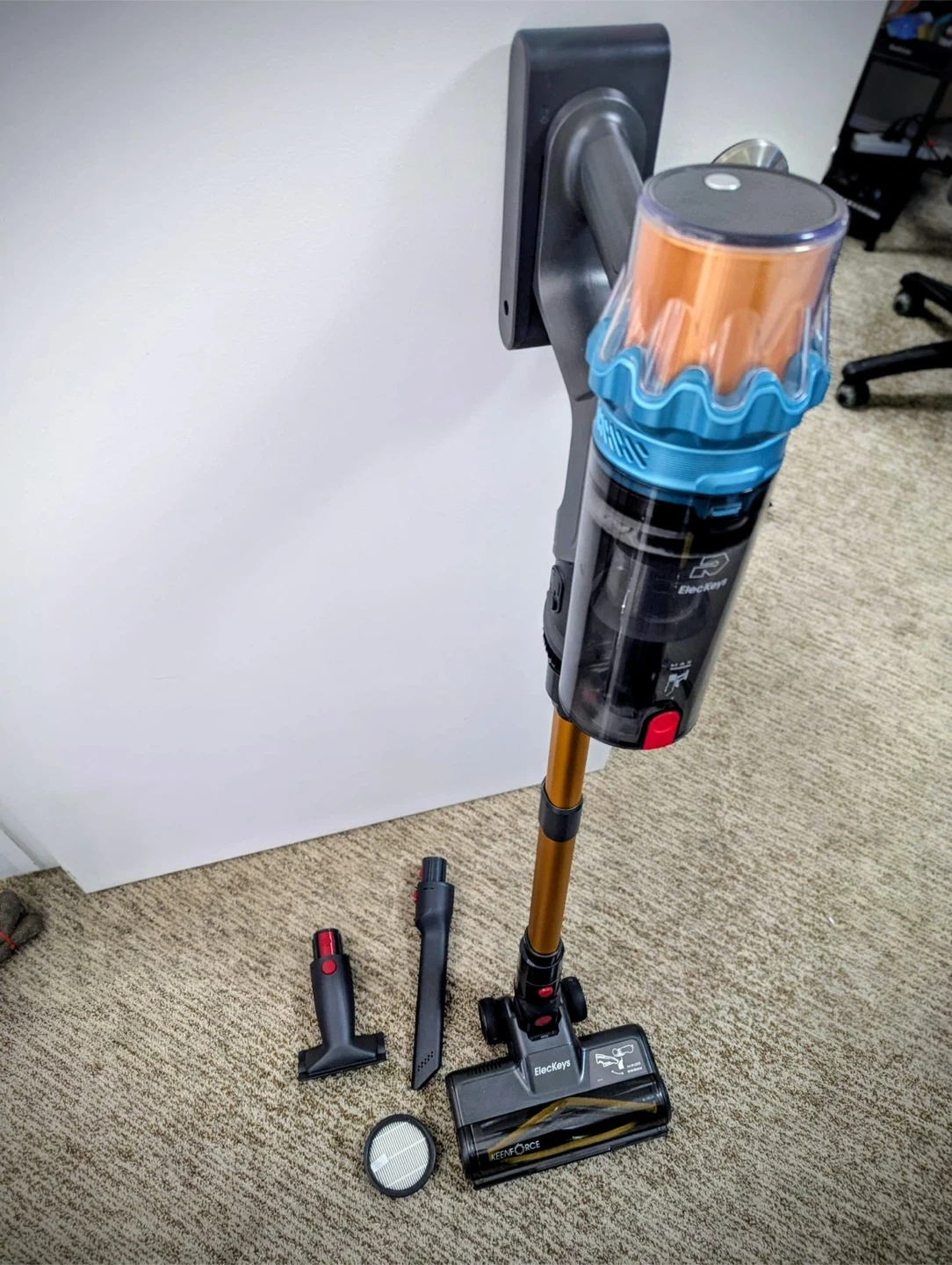 Selling an ElecKeys cordless stick vacuum! It comes with the wall mount and several attachments for different cleaning needs. This vacuum is lightweight and easy to maneuver, making cleaning a breeze