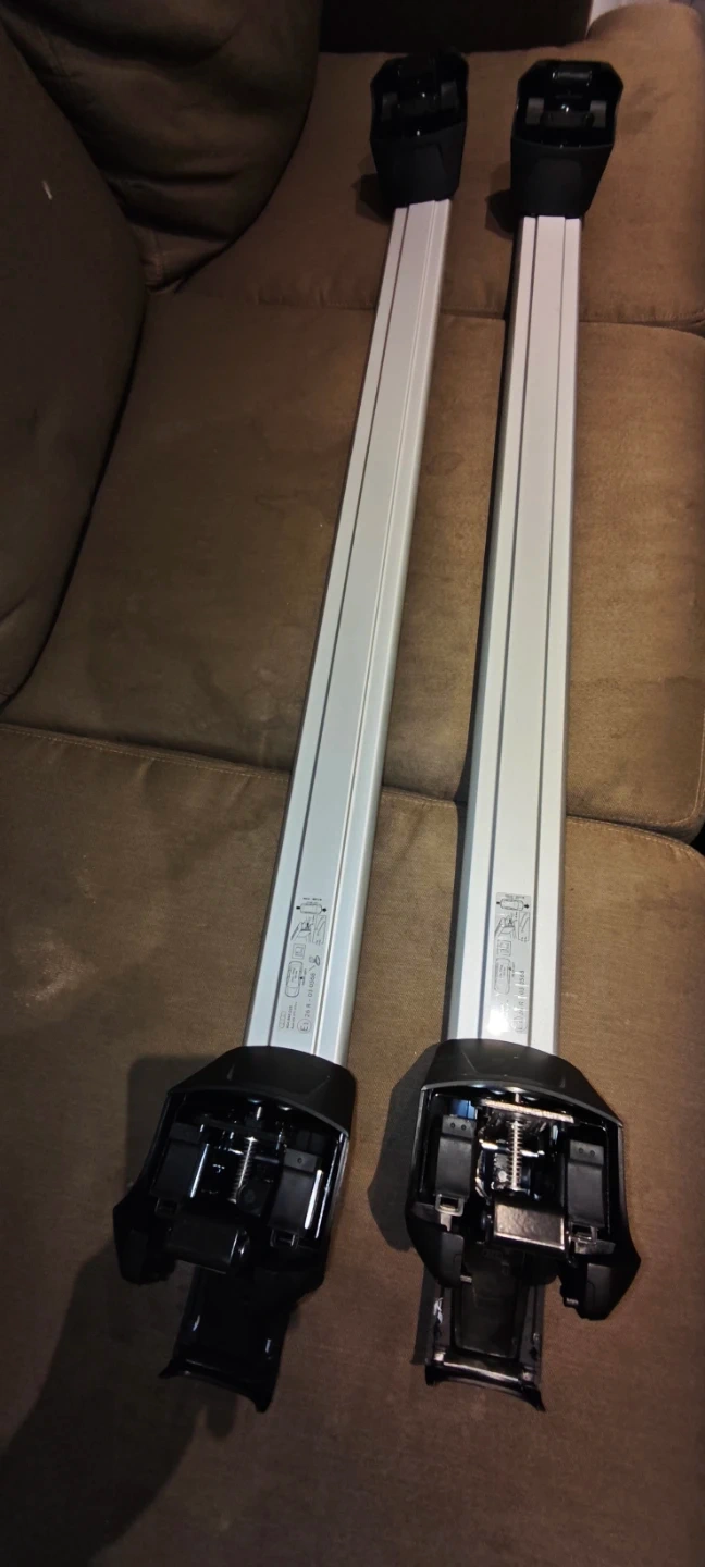 Selling a pair of roof racks for an Audi Q5 (FY 17>). They are silver in colour and in great condition. The label on the rack shows the following information:
