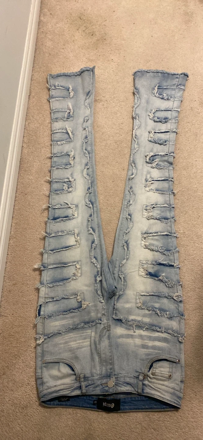 Selling a pair of Guapi designer denim jeans in size 32. These jeans feature a unique, distressed design with cutouts and a light wash. They're in great condition and ready for a new owner!