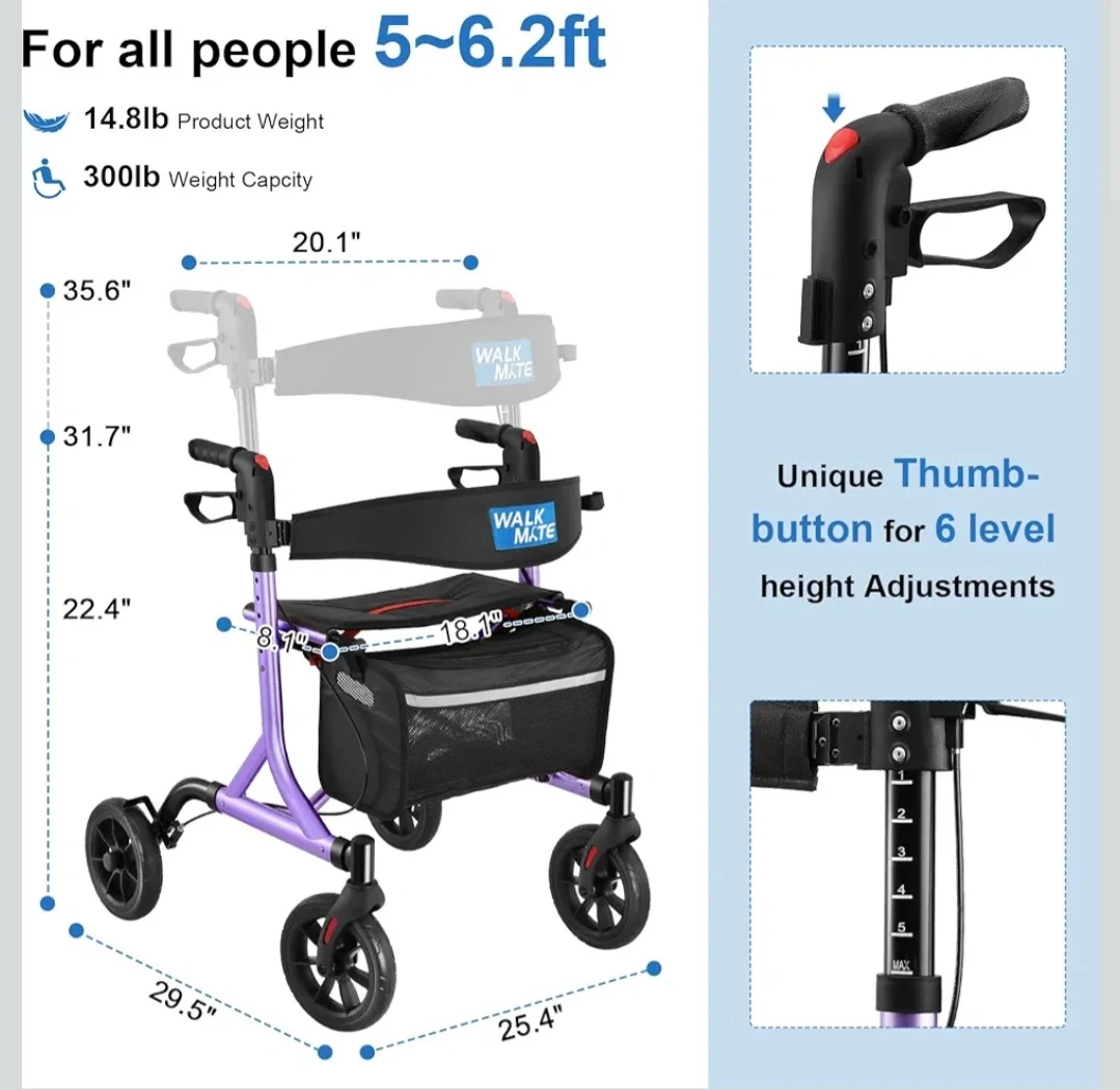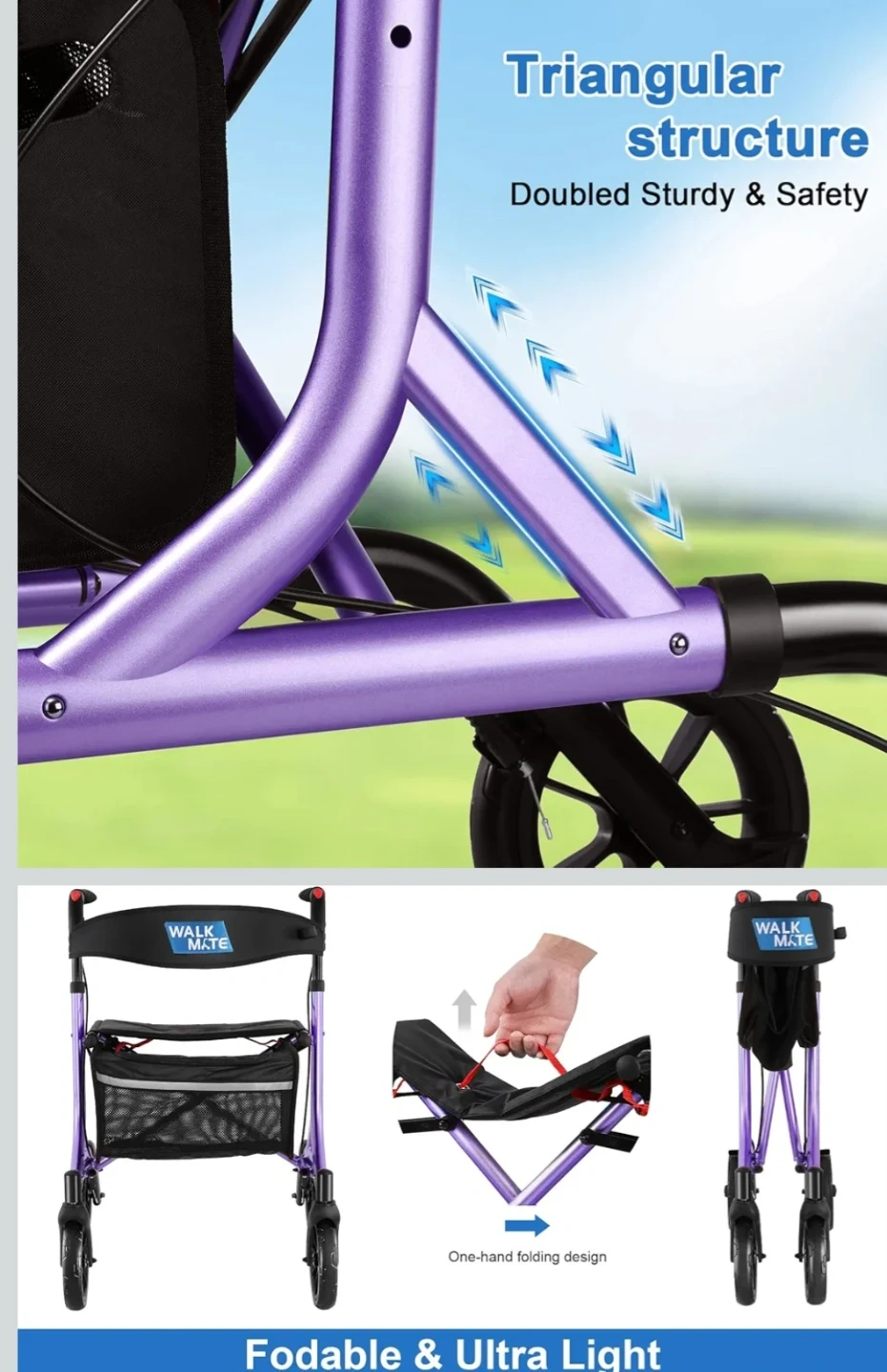 Check out this Walk Mate folding walker! It features a triangular structure for doubled sturdiness and safety. It's foldable and ultra-light, with a one-hand folding design.