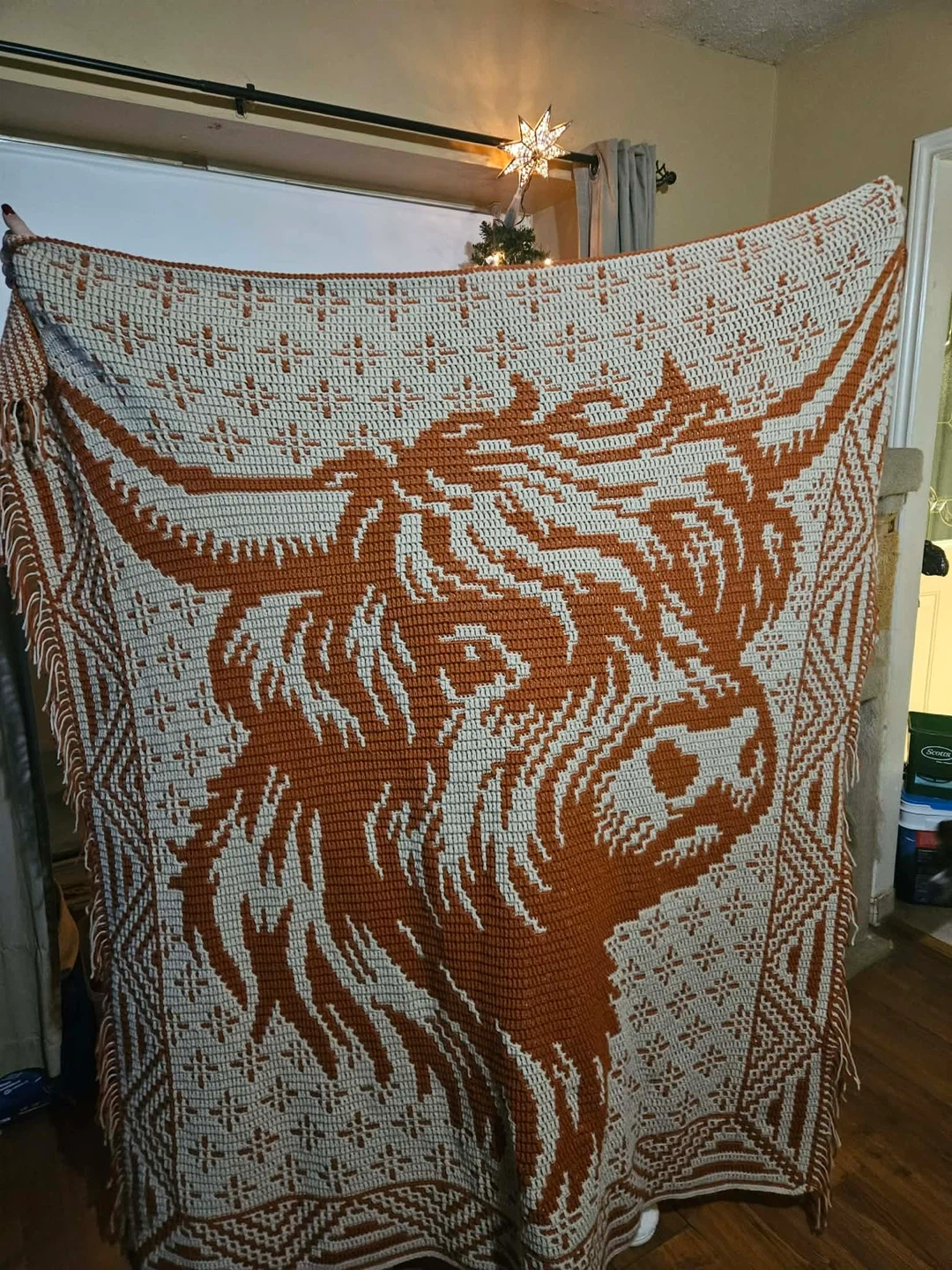 Selling a handmade crochet blanket featuring a highland cow design! It's in great condition and would be a cozy addition to any home. The blanket has a cream and brown colour scheme with a detailed pattern. It's a unique piece that would make a lovely gift!