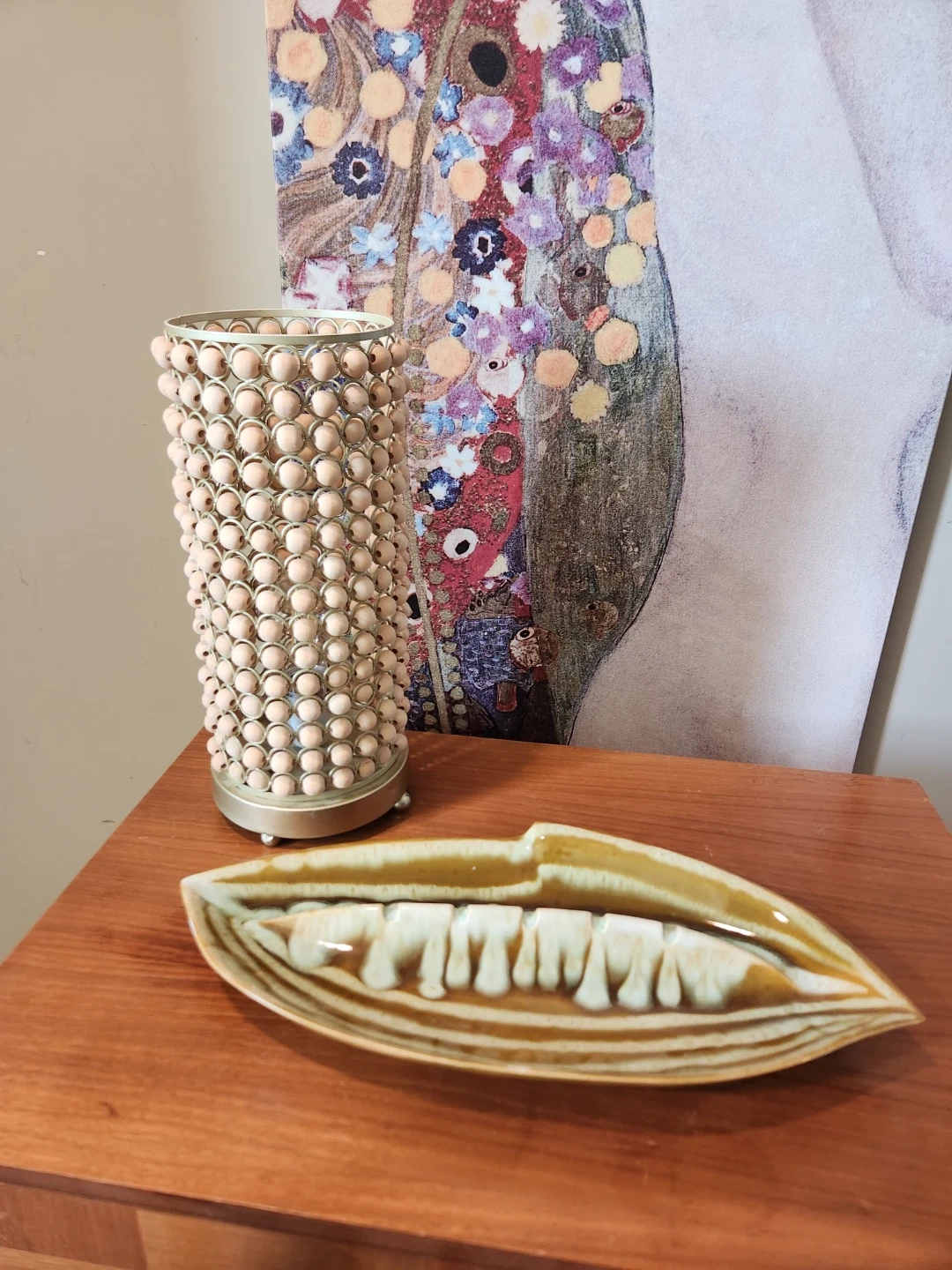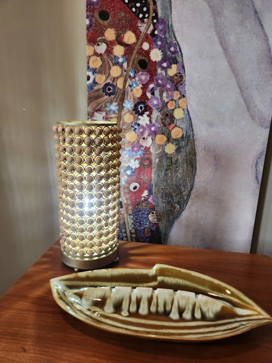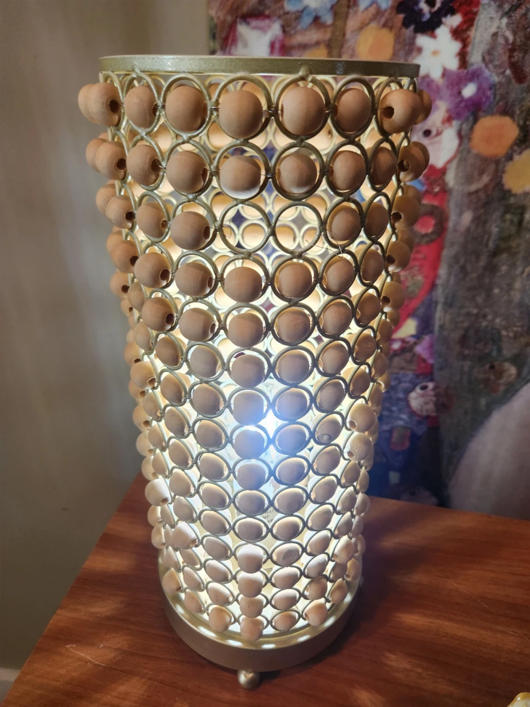 BOHO BOUTIQUE ALERT Add a unique touch to your space with this decorative table lamp! It features a metal frame adorned with natural wood beads, creating a warm and inviting glow. Perfect for a bedside table or living room accent