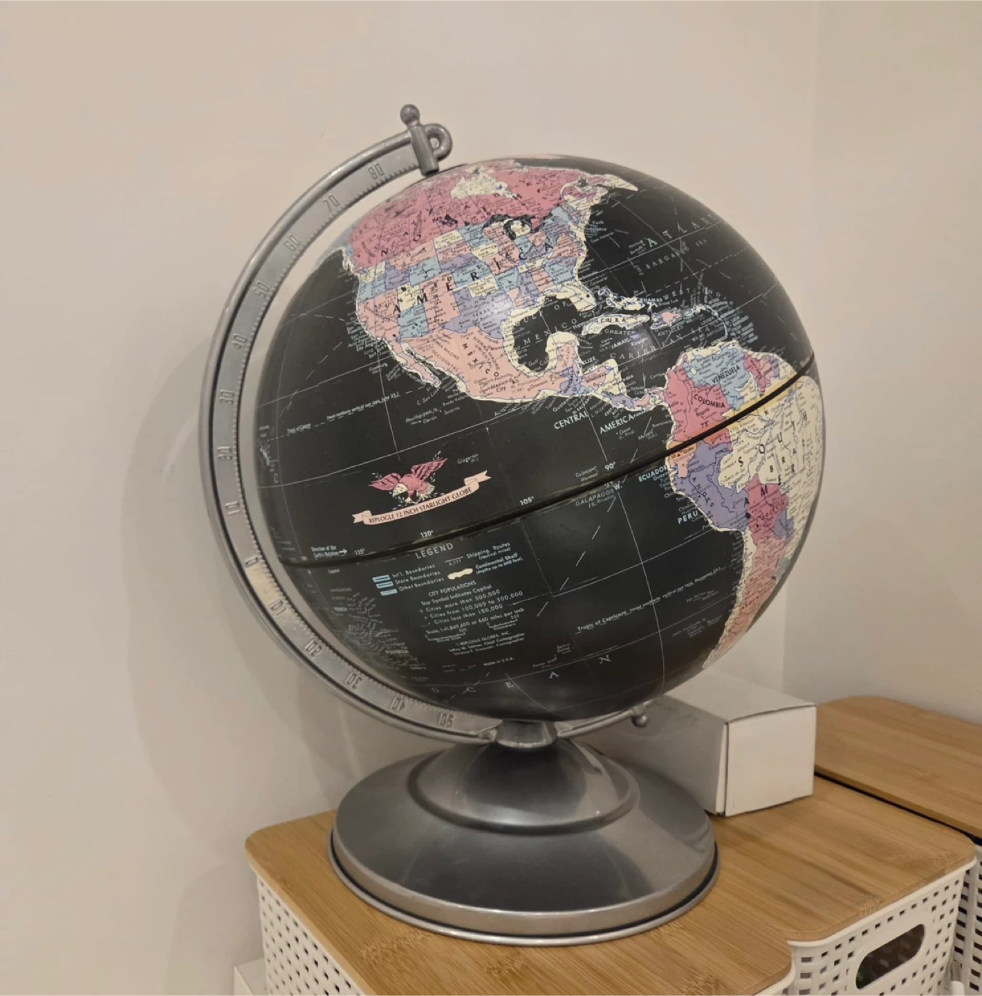 Classic black-ocean globe by Replogle. Features a 12-inch political world map with soft pastel countries, silver meridian, and a timeless library/office aesthetic. A beautiful statement piece for a study, shelf, classroom, or child’s room.