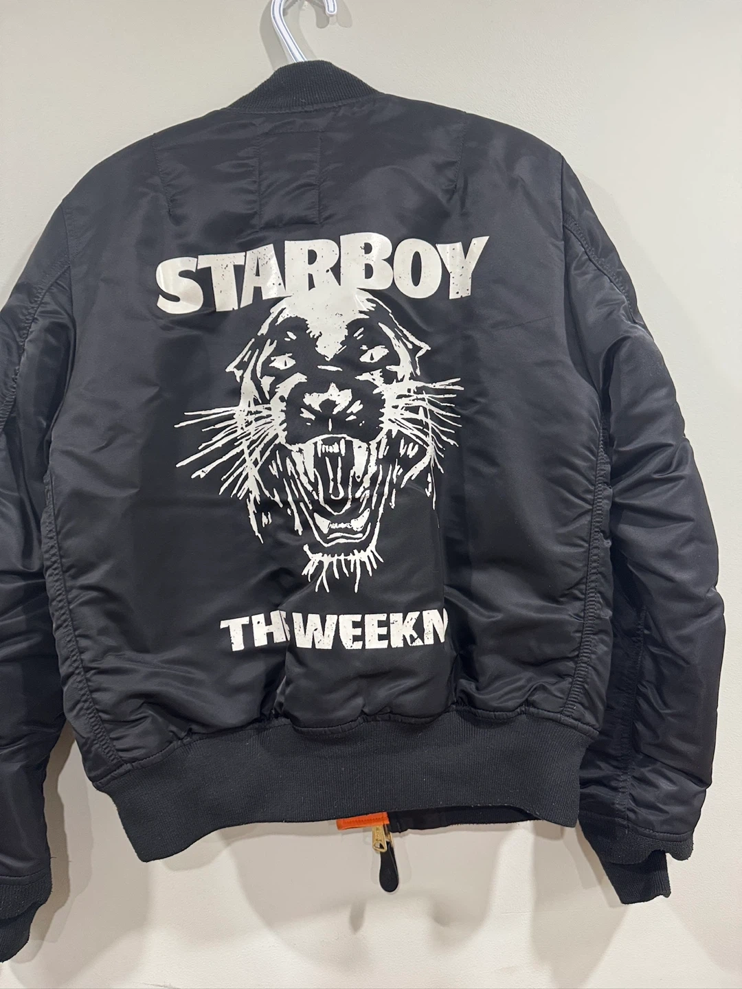 Selling a black XO The Weeknd Starboy bomber jacket in size Medium. It features the Starboy panther design on the back and the XO logo on the front. The inner lining is a bright orange colour. Perfect for any fan!