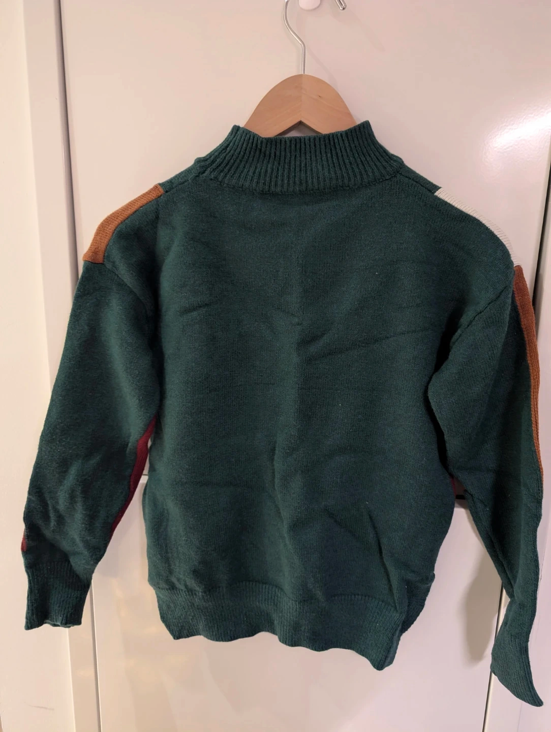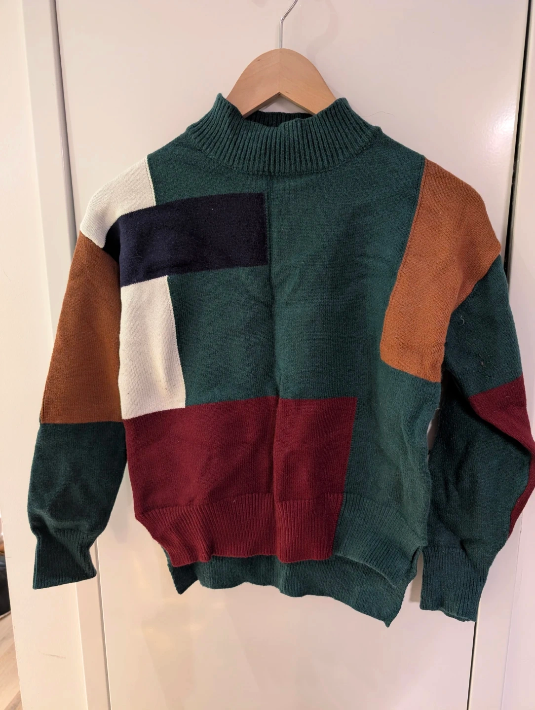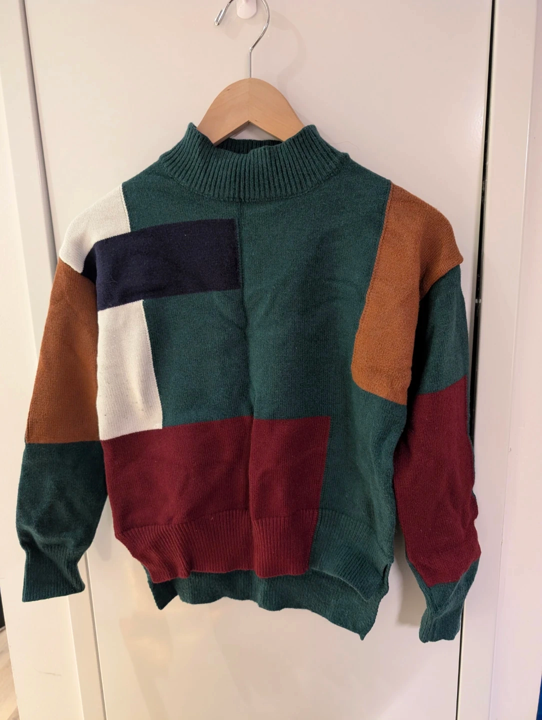 Selling a cozy colour block knit sweater. It's in great condition and perfect for layering during the cooler months. The unique design adds a fun pop of colour to any outfit!