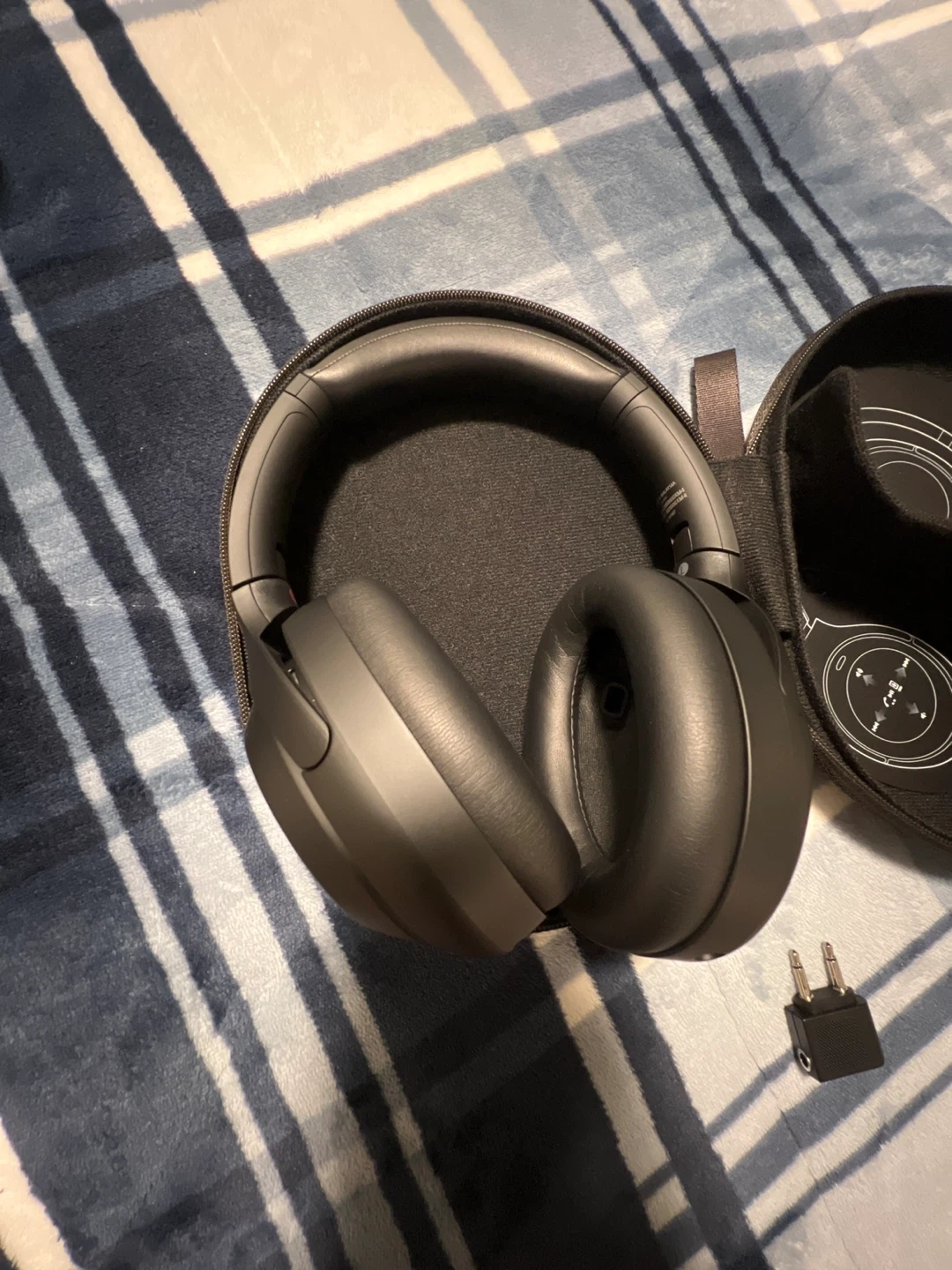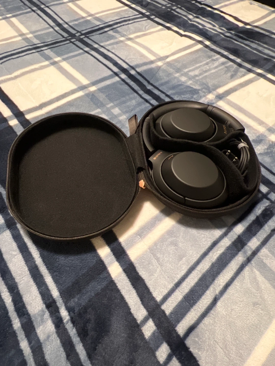 Selling Sony WH-1000XM4 wireless headphones in black. They are in great condition and come with the original carrying case, adapter, and cables. Perfect for enjoying your favourite tunes on the go!
