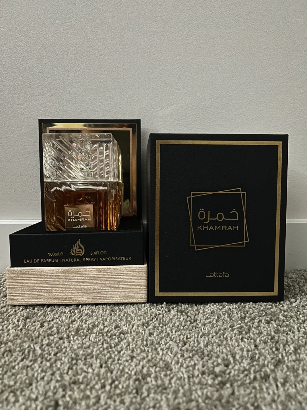 Selling a bottle of Lattafa Khamrah Eau de Parfum. It's a 100ml bottle, and comes with its original box. The bottle is 3.4 FL.OZ. This is a natural spray vaporizer, Eau De Parfum.
