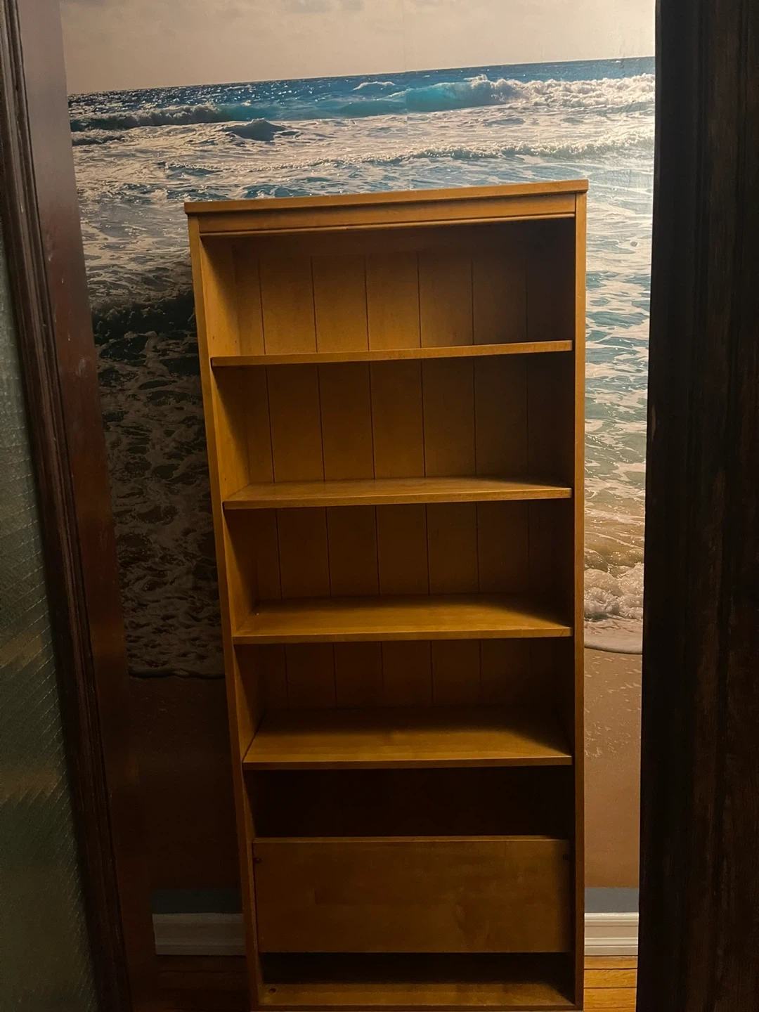 I'm selling a sturdy wooden bookcase. It has multiple shelves, perfect for storing books, displaying decor, or organizing your space. The shelves are adjustable, so you can customize the layout to suit your needs. It's in great condition and ready for a new home!