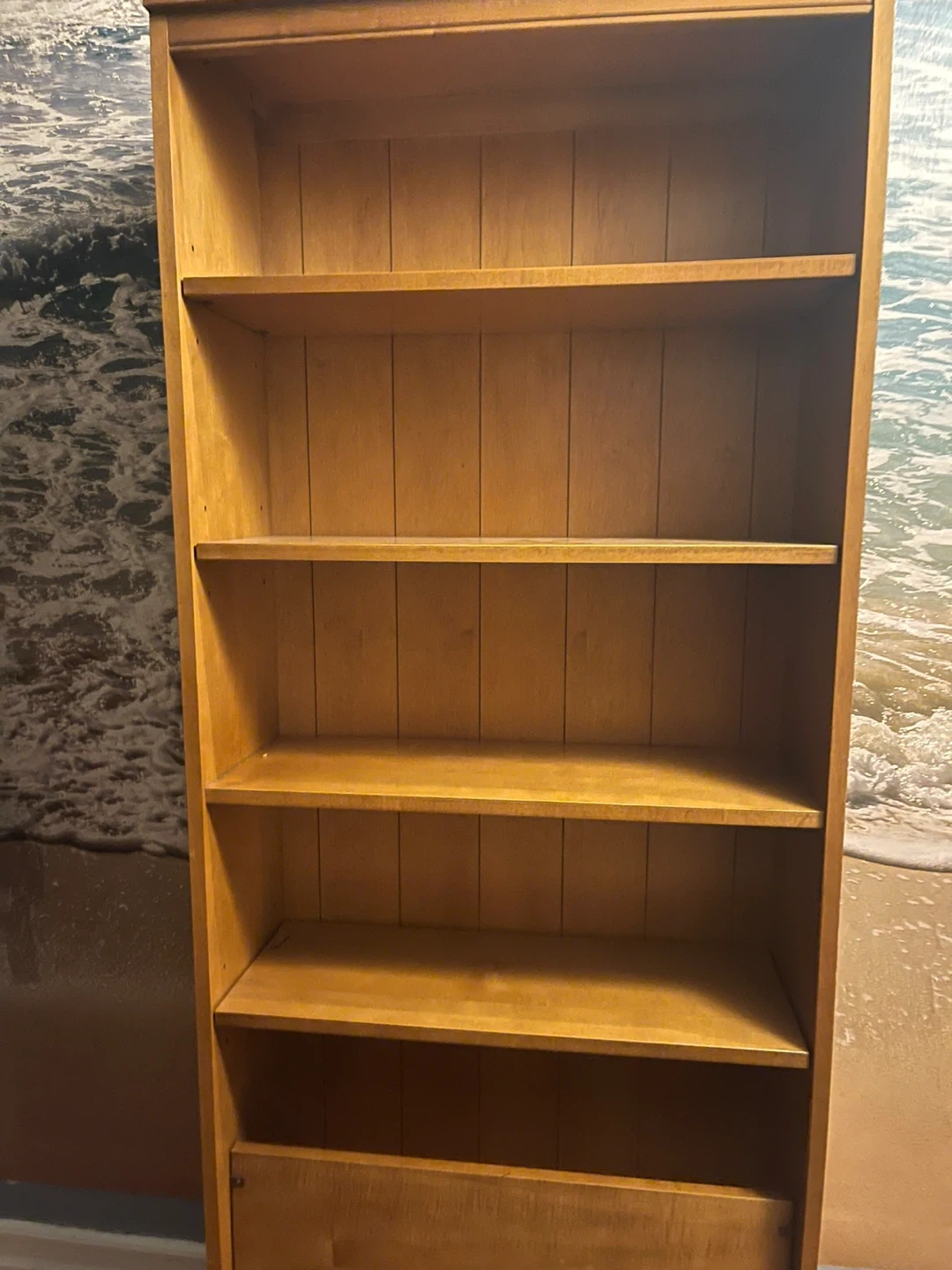 I'm selling a sturdy wooden bookcase. It has multiple shelves, perfect for storing books, displaying decor, or organizing your space. The shelves are adjustable, so you can customize the layout to suit your needs. It's in great condition and ready for a new home!