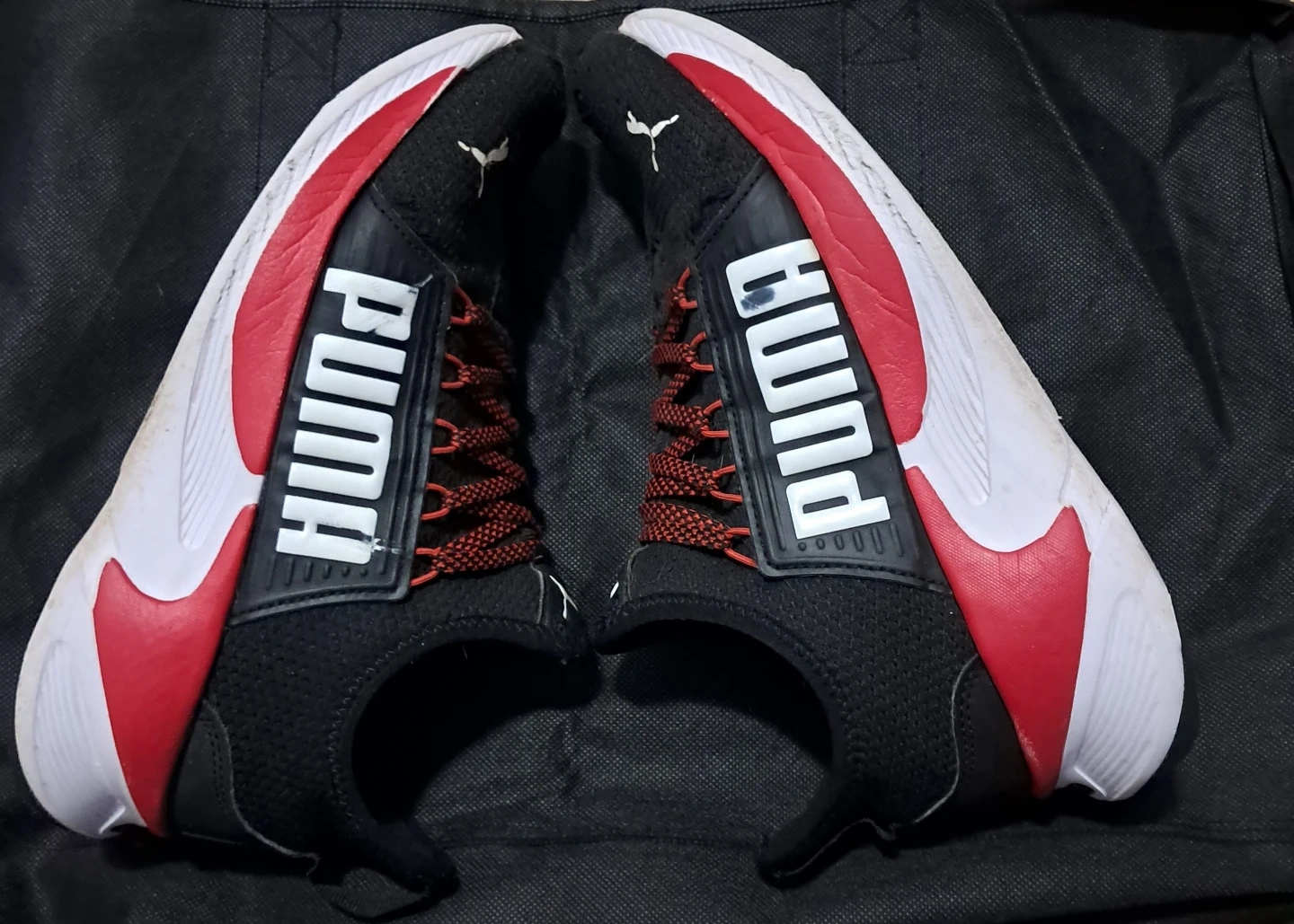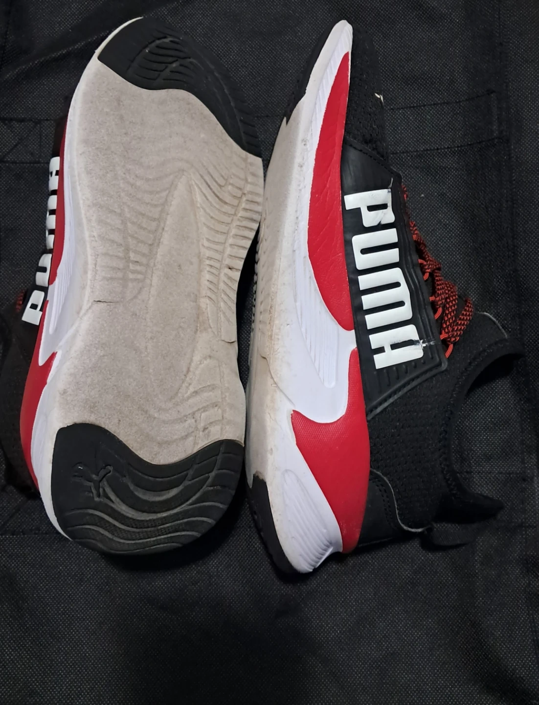 Selling a pair of Puma Sofride running shoes in black and red. They show some signs of wear, but still in good shape with lots of life left. Great for casual wear or running!