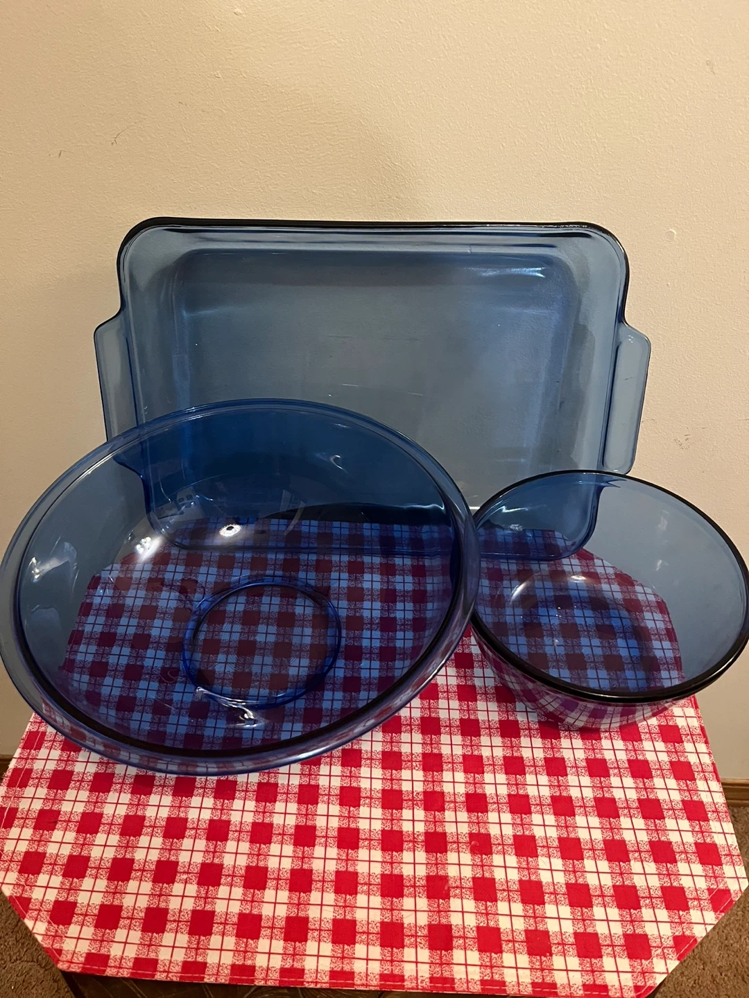 Selling a lovely vintage blue glass bowl and baking dish set! This set would be a great addition to any kitchen. The set includes a large mixing bowl 4 liters, smaller bowl 1.5 quarts and a rectangular baking dish 3 quarts.They are in great shape for their age! 1.5 quarts, 3 quarts and 4 liters.