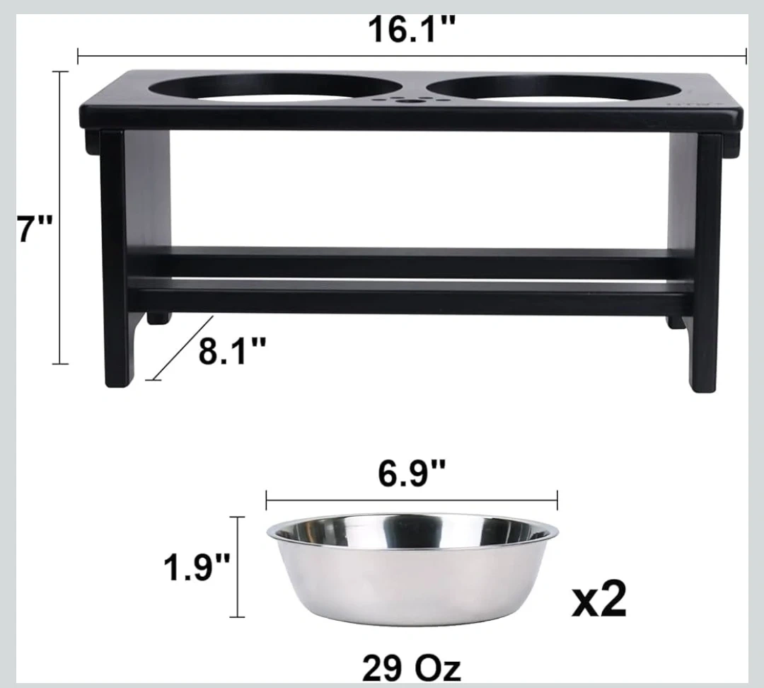 This is an HTB elevated dog bowl stand with two stainless steel bowls. It's bamboo black in colour and designed for large, medium, and small-sized breed dogs. The stand has anti-slip pads to keep it stable and is easy to move. Dimensions are 16.1" x 8.1" x 7". Each bowl is 6.9" x 1.9" and holds 29 oz