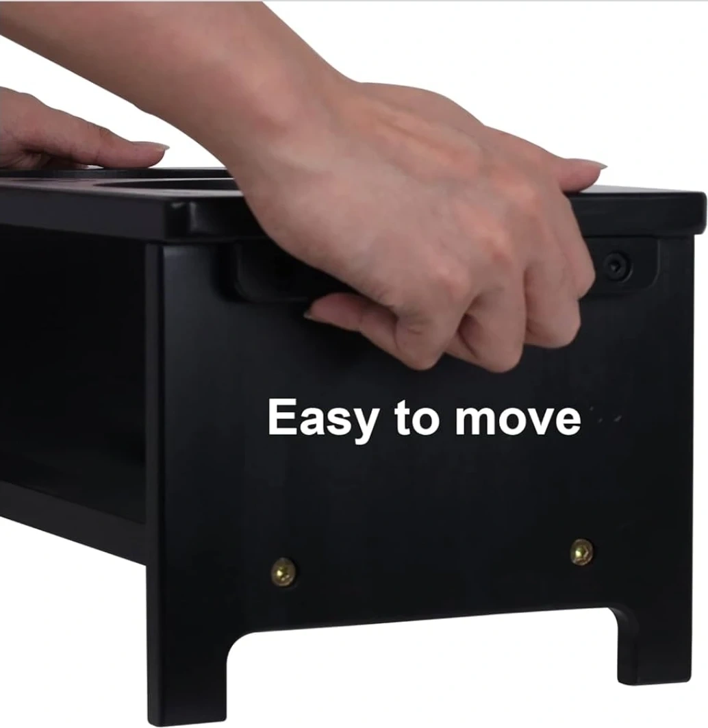 This is an HTB elevated dog bowl stand with two stainless steel bowls. It's bamboo black in colour and designed for large, medium, and small-sized breed dogs. The stand has anti-slip pads to keep it stable and is easy to move. Dimensions are 16.1" x 8.1" x 7". Each bowl is 6.9" x 1.9" and holds 29 oz