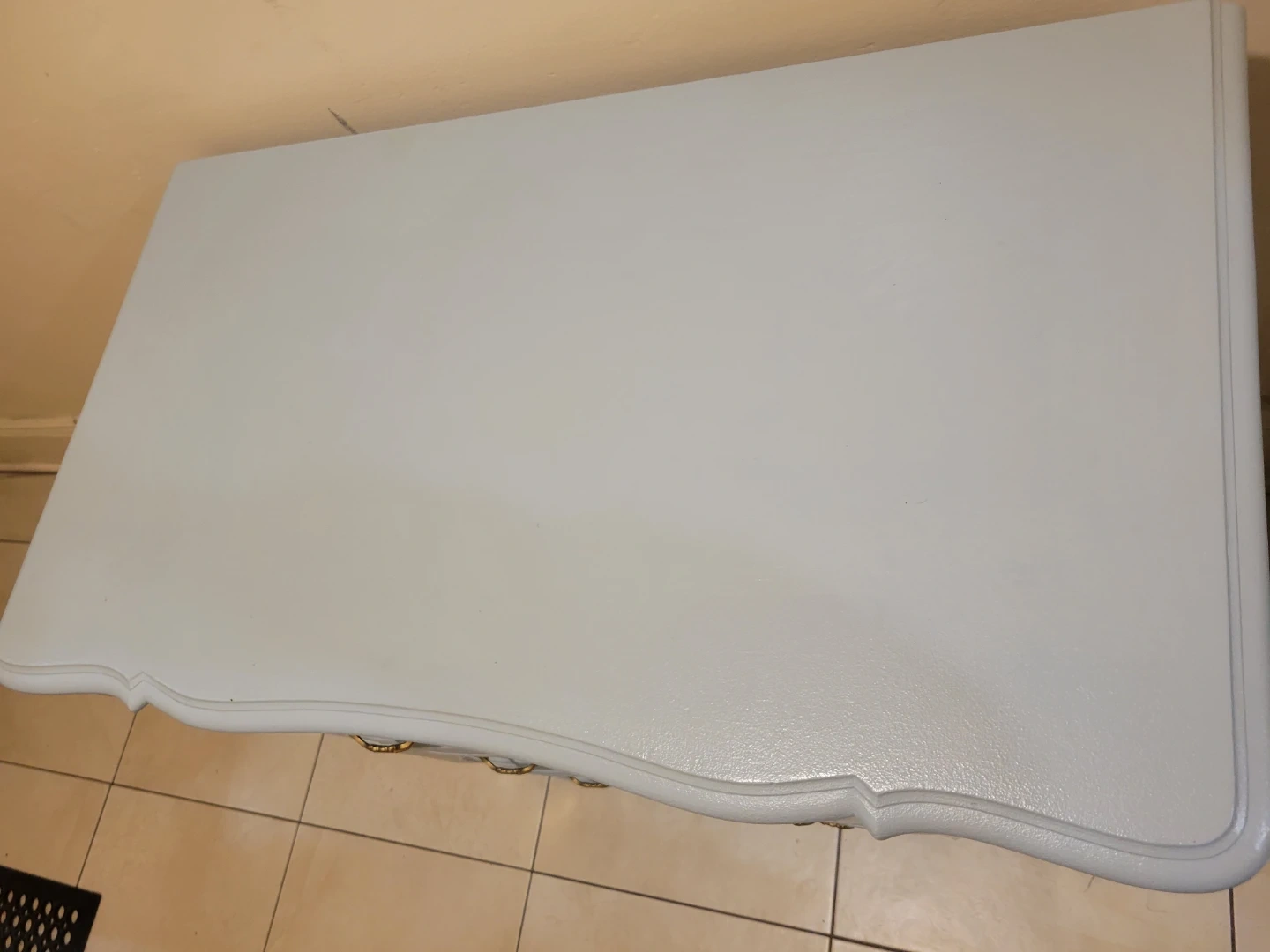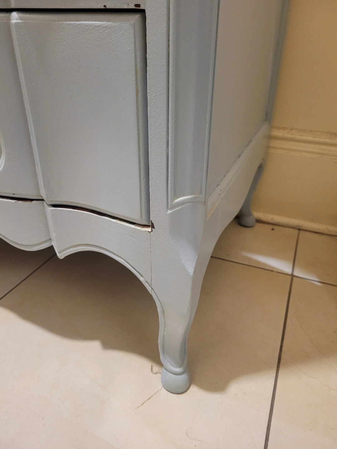 Selling a charming 3-drawer dresser with a light blue painted finish and ornate gold handles. It's a beautiful piece that could add a touch of elegance to any room. There are some signs of wear and tear, but it's still in good condition and ready for a new home. Heavy!