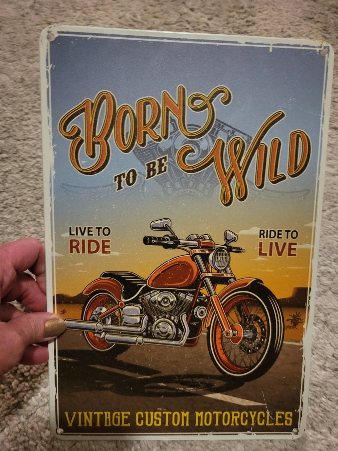 Add a touch of vintage charm to your space with this "Born to be Wild" metal sign! It features a classic motorcycle design and the phrase "Live to Ride, Ride to Live". Perfect for a garage, man cave, or any room that needs a bit of retro flair.