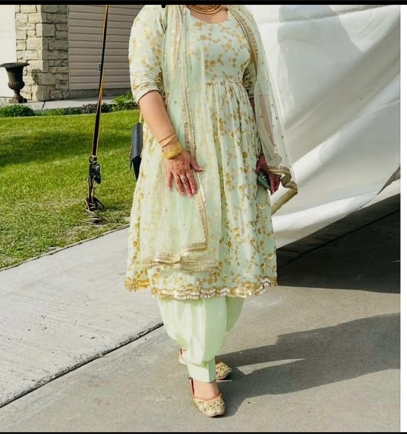Beautiful mint green Anarkali suit with gold detailing. Perfect for a special occasion or festive event!