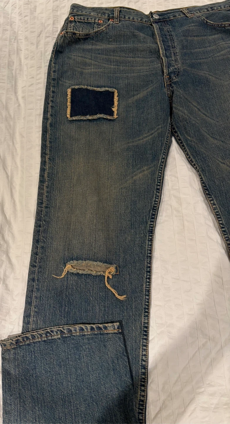 Selling a pair of Levi's jeans that have been uniquely customized with patches. They have a cool, worn-in look with some intentional distressing. These jeans are perfect for someone who loves a vintage or upcycled style. They are a standard denim material, and would be a great addition to any wardrobe!