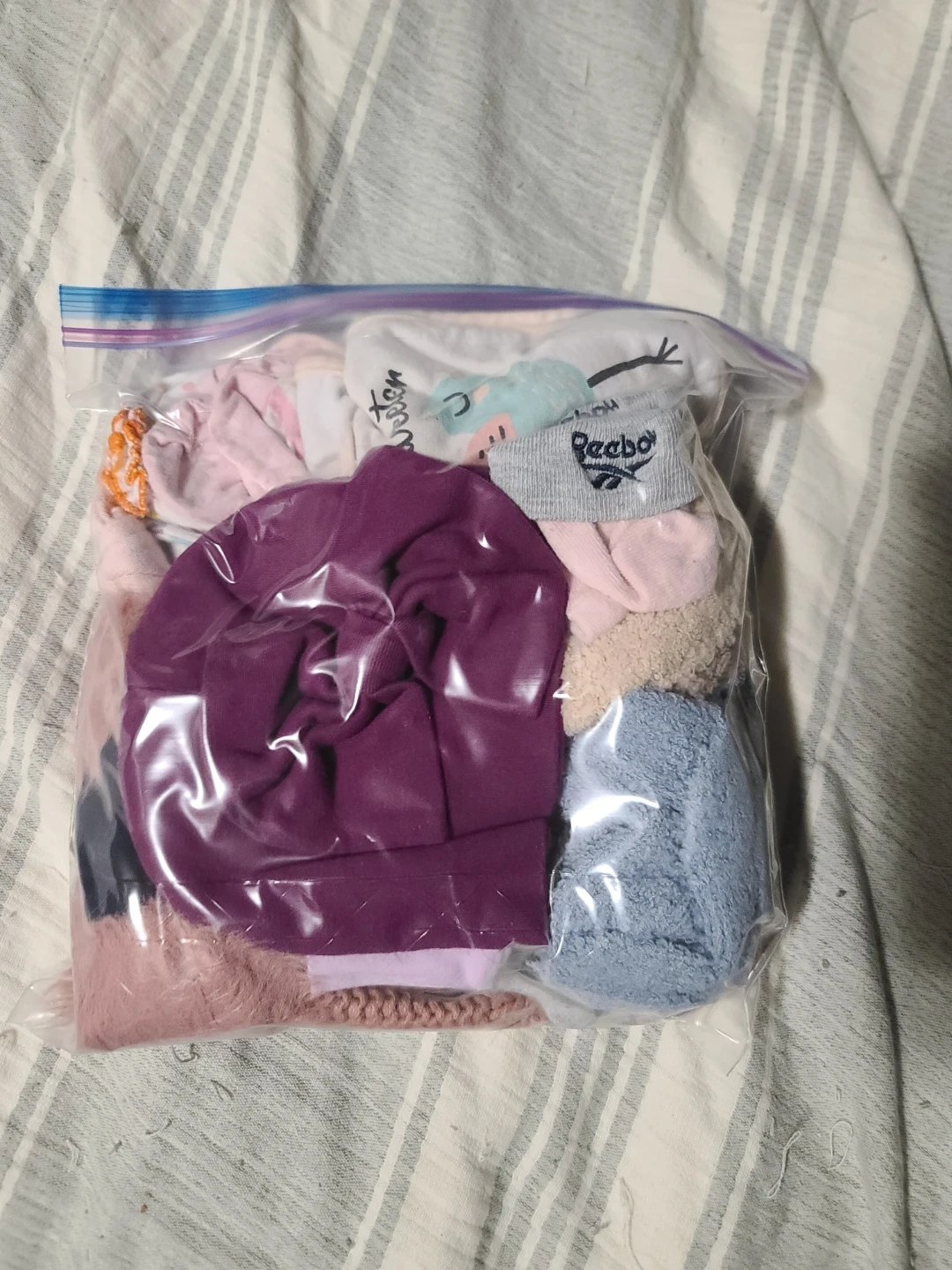 A bundle of baby hats and socks! There are various colours and styles included, perfect for keeping your little one cozy. Comes in a convenient storage bag.