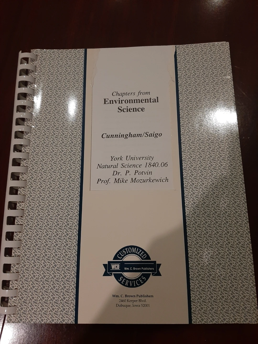 Free "Chapters from Environmental Science" by Cunningham/Saigo. It's a York University Natural Science book, customized by Wm. C. Brown Publishers. Originally bought for $65.95.