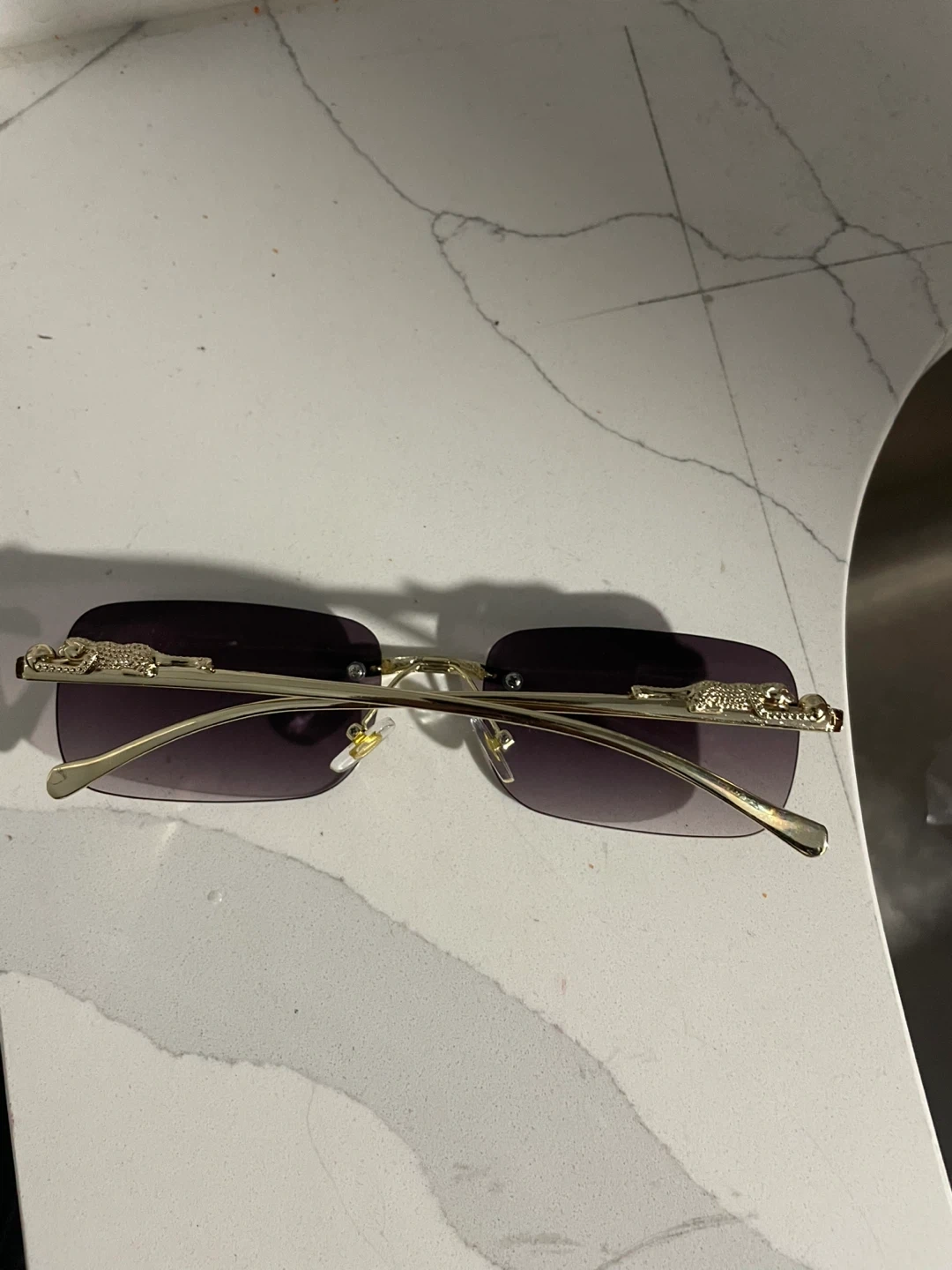Selling these rimless sunglasses with a gold frame. They have a unique design on the sides. Perfect for adding a touch of style to any outfit!